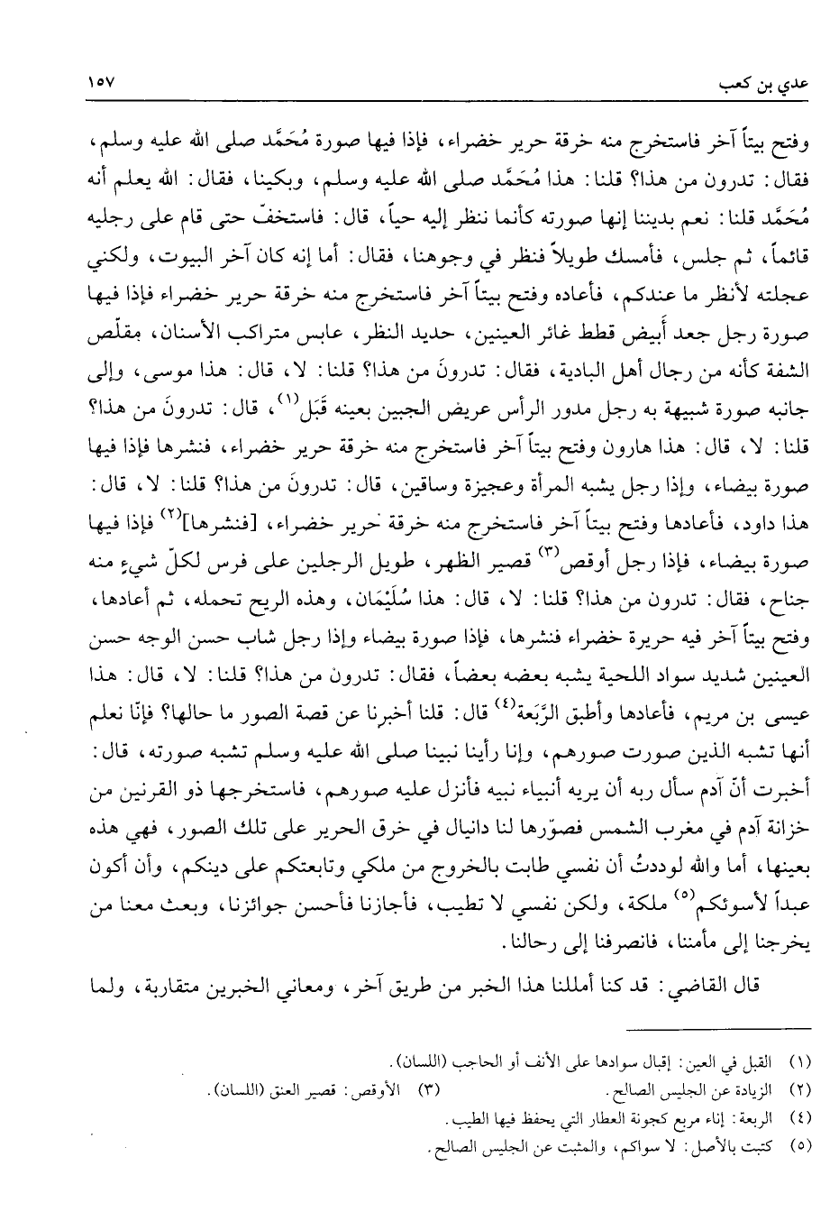 وفتح بيتا آخر فاستخرج منه خرقة حرير خضراء فإذا فيها صورة محمد (صلى الله عليه وسلم) فقال تدرون من هذا قلنا هذا محمد صلى الله عليه وسلم وبكينا فقال الله يعلم أنه محمد قلنا نعم بديننا إنها صورته كأنما ننظر إليه حيا قال فاستخف حتى قام على رجليه قائما ثم جلس فأمسك طويلا فنظر في وجوهنا فقال أما إنه كان آخر البيوت ولكني عجلته لأنظر ما عندكم فأعاده وفتح بيتا آخر فاستخرج منه خرقة حرير خضراء فإذا فيها صورة رجل جعد أبيض قطط غائر العينين حديد النظر عابس متراكب الأسنان مقلص الشفة كأنه من رجال أهل البادية فقال تدرون من هذا قلنا لا قال هذا موسى وإلى جانبه صورة شبيهة به رجل مدور الراس عريض الجبين بعينه قبل (1) قال تدرون من هذا قلنا لا قال هذا هارون وفتح بيتا آخر فاستخرج منه خرقة حرير خضراء فنشرها فإذا فيها صورة بيضاء وإذا رجل يشبه المرأة وعجيزة وساقين قال تدرون من هذا قلنا لا قال هذا داود فأعادها وفتح بيتا آخر فاستخرج منه خرقة حرير خضراء فنشرها (2) فإذا فيها صورة بيضاء فإذا رجل أوقص (3) قصير الظهر طويل الرجلين على فرس لكل شئ منه جناج فقال تدرون من هذا قلنالا قال هذا سليمان وهذه الريح تحمله ثم أعادها وفتح بيتا آخر فيه حريرة خضراء فنشرها فإذا صورة بيضاء وإذا رجل شاب حسن الوجه حسن العينين شديد سواد اللحية يشبه بعضه بعضا فقال تدرون من هذا قلنا لا قال هذا عيسى بن مريم فأعادها وأطبق الربعة (4) قال قلنا أخبرنا عن قصة الصور ما حالها فإنا نعلم أنها تشبه الذين صور ت صورهم وإنا رأينا نبينا (صلى الله عليه وسلم) تشبه صورته قال أخبرت أن آدم سأل ربه أن يريه أنبياء نبيه فأنزل عليه صورهم فاستخرجها ذو القرنين من خزانة آدم في مغرب الشمس فصورها لنا دانيال في خرق الحرير على تلك الصور فهي هذه بعينها أما والله لوددت أن نفسي طابت بالخروج من ملكي وتابعتكم على دينكم وأن أكون (5) عبدا لأسوئكم ملكة ولكن نفسي لا تطيب فأجازنا فأحسن جوائزنا وبعث معنا من يخرجنا إلى مأمننا فانصرفنا إلى رحالنا قال القاضي قد كنا أمللنا هذا الخبر مطريق آخر ومعاني الخبرين متقاربة ولما