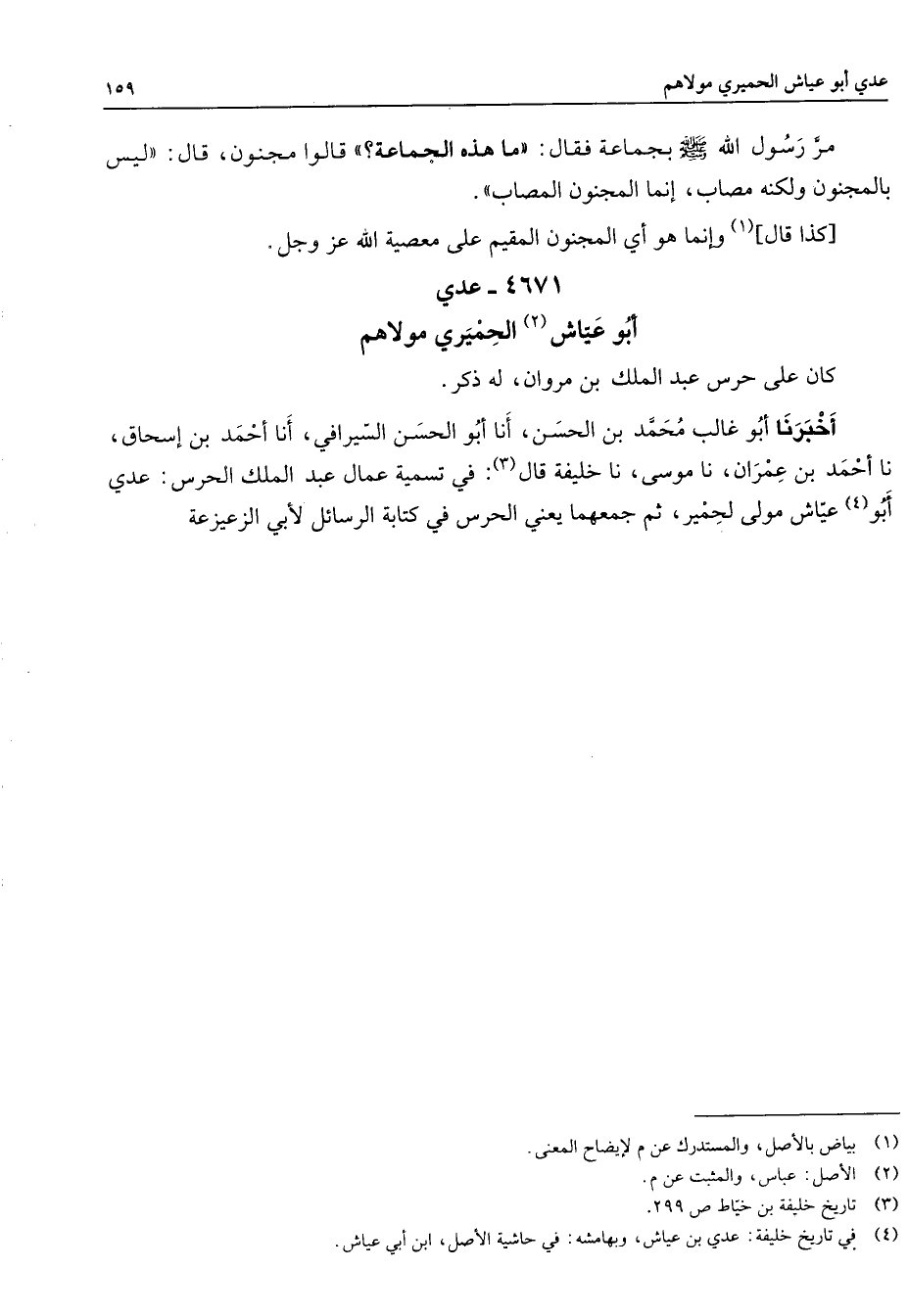 4671 - عدي أبو عياش (2) الحميري مولاهم كان على حرس عبد الملك بن مروان له ذكر أخبرنا أبو غالب محمد بن الحسن أنا أبو الحسن السيرافي أنا أحمد بن إسحاق نا أحمد بن عمران نا موسى نا خليفة قال (3) في تسمية عمال عبد الملك الحرس عدي أبو (4) عياش مولى لحمير ثم جمعهما يعني الحرس في كتابة الرسائل لأبي الزعيزعة