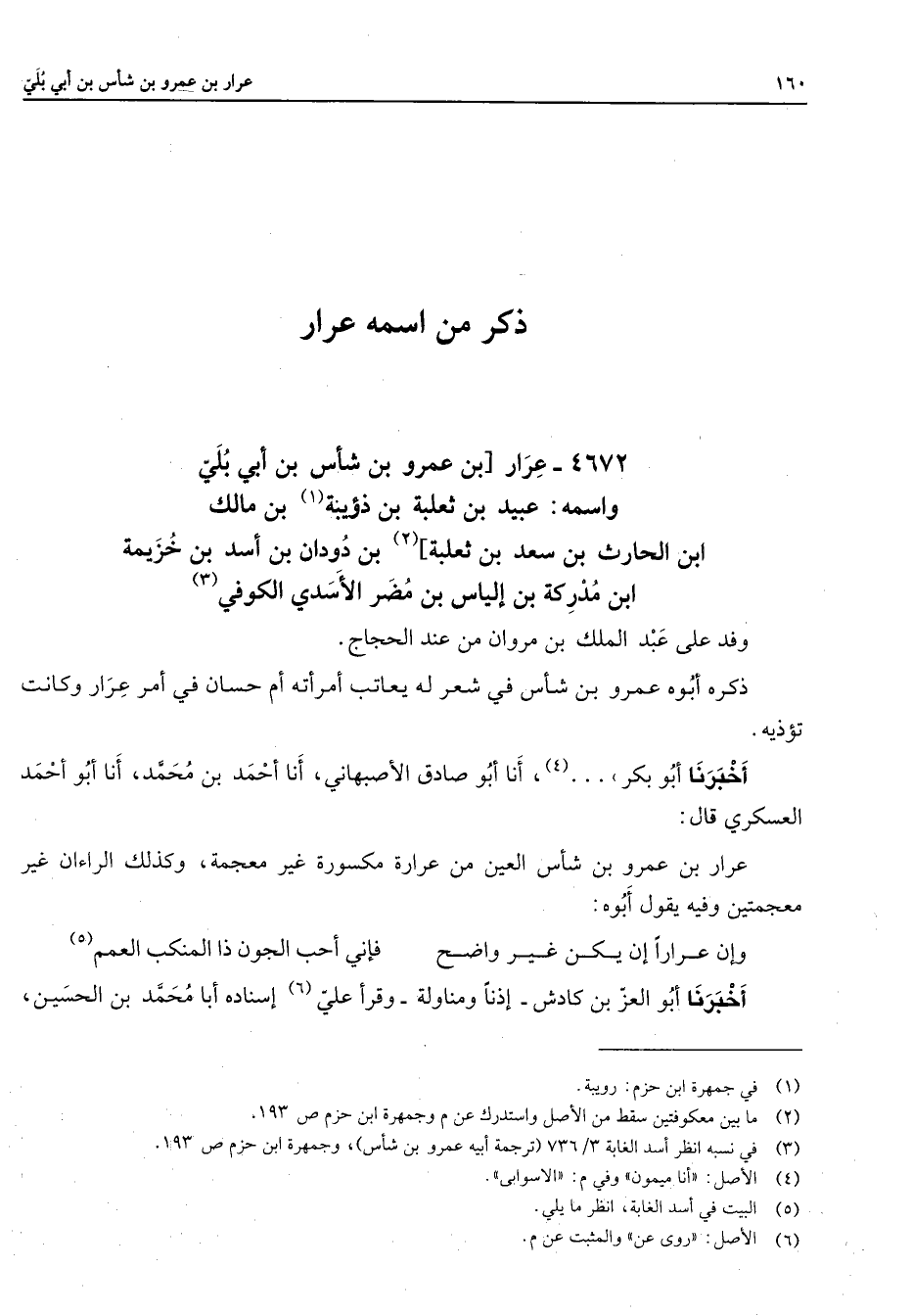 4672 - عرار بن عمرو بن شأس بن أبي بلي واسمه عبيد بن ثعلبة بن ذؤيبة (1) بن مالك بن الحارث بن سعد بن ثعلبة (2) بن دودان بن أسد بن خزيمة بن مدركة بن إلياس بن مضر الأسدي الكوفي (3) وفد على عبد الملك بن مروان من عند الحجاج ذكره أبوه عمرو بن شأس في شعر له يعاتب أمرأته أم حسان في أمر عرار وكانت تؤذيه أخبرنا أبو بكر (4) أنا أبو صادق الأصبهاني أنا أحمد بن محمد أنا أبو أحمد العسكري قال عرار بن عمرو بن شأس العين من عرارة مكسورة غير معجمة وكذلك الراءان غير معجمتين وفيه يقول أبوه * وإن عرارا إن يكن غير واضح * فإني أحب الجون ذا المنكب العمم (5) * أخبرنا أبو العز بن كادش إذنا ومناولة وقرأ علي (6) إسناده أبا محمد بن الحسين