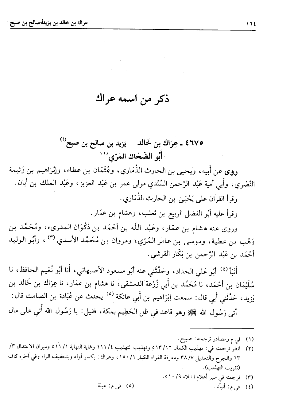 (2) انظر ترجمته في: تهذيب الكمال 12 / 513 وتهذيب التهذيب 4 / 111 وغاية النهاية 1 / 511 وميزان الاعتدال 3 / 63 والجرح والتعديل 7 / 38 ومعرفة القراء الكبار 1 / 150، وعراك: بكسر أوله وبتخفيف الراء وفي آخره كاف (تقريب التهذيب)