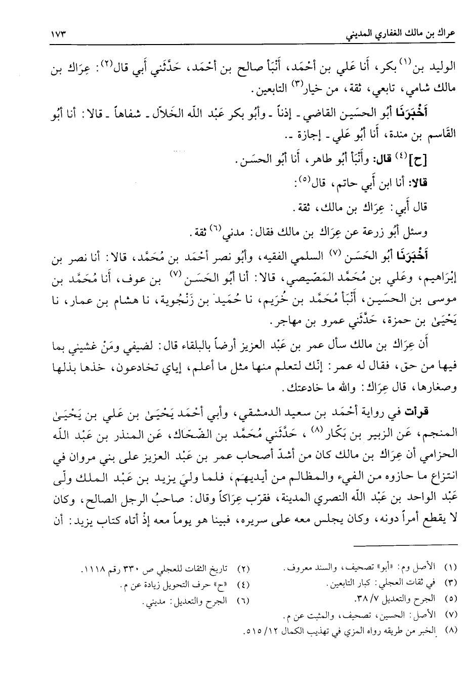 الوليد بن (1) بكر أنا علي بن أحمد أنبأ صالح بن أحمد حدثني أبي قال (2) عراك بن مالك شامي تابعي ثقة من خيار (3) التابعين أخبرنا أبو الحسين القاضي إذنا وأبو بكر عبد الله الخلال شفاها قالا أنا أبو القاسم بن مندة أنا أبو علي إجازة ح (4) قال وأنبأ أبو طاهر أنا أبو الحسن قالا أنا ابن أبي حاتم قال (5) قال أبي عراك بن مالك ثقة وسئل أبو زرعة عن عراك بن مالك فقال مدني (6) ثقة أخبرنا أبو (7) الحسن السلمي الفقيه وأبو نصر أحمد بن محمد قالا أنا نصر بن إبراهيم وعلي بن محمد المصيصي قالا أنا أبو الحسن (7) بن عوف أنا محمد بن موسى بن الحسين أنبأ محمد بن خريم نا حميد بن زنجوية أنا هشام بن عمار نا يحيى بن حمزة حدثني عمرو بن مهاجر أن عراك بن مالك سأل عمر بن عبد العزيز أرضا بالبلقاء قال لضيفي ومن غشيني بما فيها من حق فقال له عمر إنك لتعلم منها مثل ما أعلم إياي تخادعون خذها بذلها وصغارها قال عراك والله ما خادعتك قرأت في رواية أحمد بن سعيد الدمشقي وأبي أحمد يحيى بن علي بن يحيى المنجم عن الزبير بن بكار (8) حدثني محمد بن الضحاك عن المنذر بن عبد الله الحزامي أن عراك بن مالك كان من أشد أصحاب عمر بن عبد العزيز على بني مروان في انتزاع ما حازوه من الفئ والمظالم من أيديهم فلما ولي يزيد بن عبد الملك ولى عبد الواحد بن عبد الله النصري المدينة فقرب عراكا وقال صاحب الرجل الصالح وكان لا يقطع أمرا دونه وكان يجلس معه على سريره فبينا هو يوما معه إذ أتاه كتاب يزيد أن