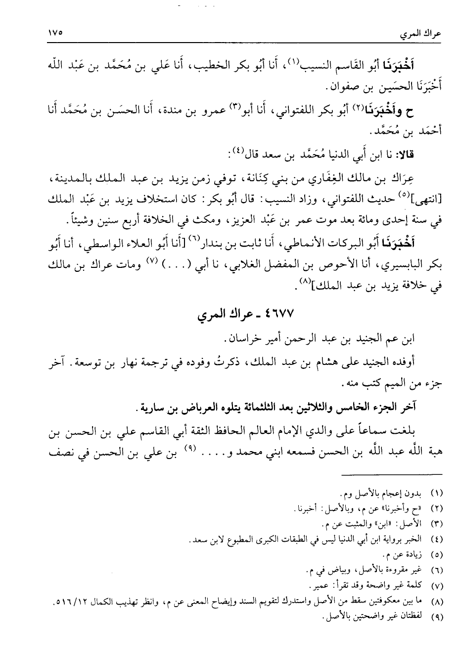 4677 - عراك المري ابن عم الجنيد بن عبد الرحمن أمير خراسان أوفده الجنيد على هشام بن عبد الملك ذكرت وفوده في ترجمة نهار بن توسعة آخر جزء من الميم كتب منه آخر الجزء الخامس والثلاثين بعد الثلثمائة يتلوه العرباض بن سارية بلغت سماعا على والدي الإمام العالم الحافظ الثقة أبي القاسم علي بن الحسن بن هبة الله عبد الله بن الحسن فسمعه ابني محمد و (9) بن علي بن الحسن في نصف