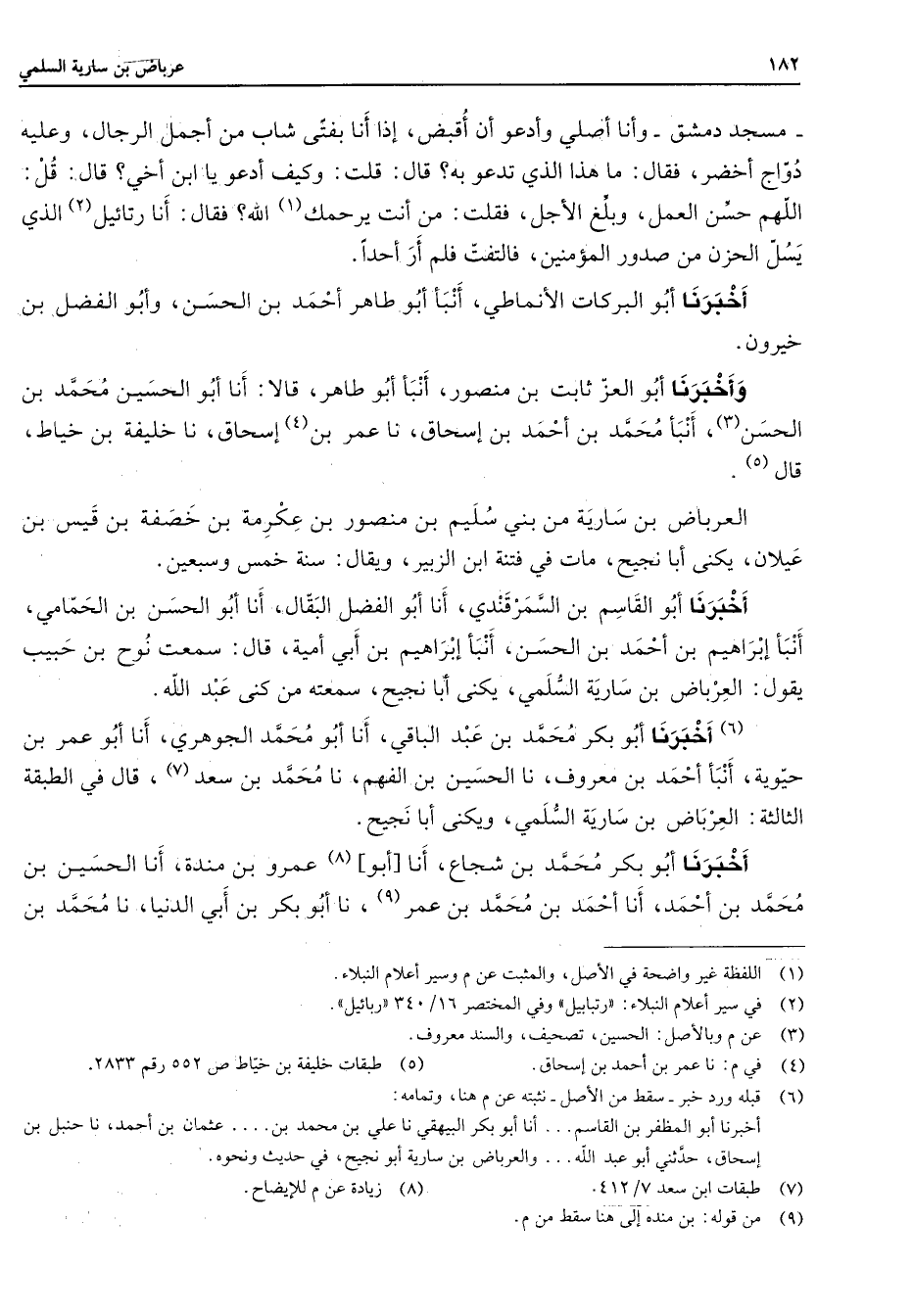 مسجد دمشق وأنا أصلي وأدعو أن أقبض إذا أنا بفتى شاب من أجمل الرجال وعليه دواج أخضر فقال ما هذا الذي تدعو به قال قلت وكيف أدعو يا ابن أخي قال قل اللهم حسن العمل وبلغ الأجل فقلت من أنت يرحمك (1) الله فقال أنا رتائيل (2) الذي يسل الحزن من صدور المؤمنين فالتفت فلم أر أحدا أخبرنا أبو البركات الأنماطي أنبأ أبو طاهر أحمد بن الحسن وأبو الفضل بن خيرون وأخبرنا أبو العز ثابت بن منصور أنبأ أبو طاهر قالا أنا أبو الحسين محمد بن الحسن (3) أنبأ محمد بن أحمد بن إسحاق نا عمر بن (4) إسحاق نا خليفة بن خياط قال (5) العرباض بن سارية من بني سليم بن منصور بن عكرمة بن خصفة بن قيس بن عيلان يكنى أبا نجيح مات في فتنة ابن الزبير ويقال سنة خمس وسبعين أخبرنا أبو القاسم بن السمرقندي أنا أبو الفضل البقال أنا أبو الحسن بن الحمامي أنبأ إبراهيم بن أحمد بن الحسن أنبأ إبراهيم بن أبي أمية قال سمعت نوح بن حبيب يقول العرباض بن سارية السلمي يكنى أبا نجيح سمعته من كنى عبد الله (6) أخبرنا أبو بكر محمد بن عبد الباقي أنا أبو محمد الجوهري أنا أبو عمر بن حيوية أنبأ أحمد بن معروف نا الحسين بن الفهم نا محمد بن سعد (7) قال في الطبقة الثالثة العرباض بن سارية السلمي ويكنى أبا نجيح أخبرنا أبو بكر محمد بن شجاع أنا أبو (8) عمرو بن مندة أنا الحسين بن محمد بن أحمد أنا أحمد بن محمد بن عمر (9) نا أبو بكر بن أبي الدنيا نا محمد بن