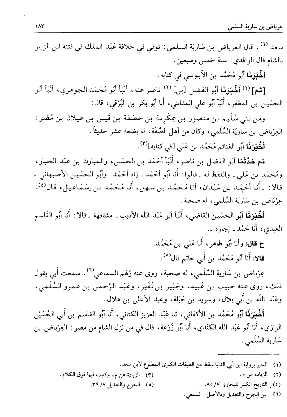 سعد (1) قال العرباض بن سارية السلمي توفي في خلافة عبد الملك في فتنة ابن الزبير بالشام قال الواقدي سنة خمس وسبعين أخبرنا أبو محمد بن الآبنوسي في كتابه ثم أخبرنا أبو الفضل بن (2) ناصر عنه أنبأ أبو محمد الجوهري أنبأ أبو الحسين بن المظفر أنبأ أبو علي المدائني أنا أبو بكر بن البرقي قال ومن بني سليم بن منصور بن عكرمة بن خصفة بن قيس بن عيلان بن مضر العرباض بن سارية السلمي وكان من أهل الصفة له بضعة عشر حديثا أخبرنا أبو الغنائم محمد بن علي في كتابه (3) ثم حدثنا أبو الفضل بن ناصر أنبأ أحمد بن الحسن والمبارك بن عبد الجبار ومحمد بن علي واللفظ له قالوا أنا أبو أحمد زاد أحمد وأبو الحسين الأصبهاني قالا أنا أحمد بن عبدان أنا محمد بن سهل أنا محمد بن إسماعيل قال (4) عرباض بن سارية السلمي له صحبة أخبرنا أبو الحسين القاضي أنبأ أبو عبد الله الأديب مشافهة قالا أنا أبو القاسم العبدي أنا حمد إجازة قالا أنا أبو محمد بن أبي حاتم قال (5) عرباض بن سارية السلمي له صحبة روى عنه رهم السماعي (6) سمعت أبي يقول ذلك روى عنه حبيب بن عبيد وجبير بن نفير وعبد الرحمن بن عمرو السلمي وعبد الله بن ابي بلال وسويد بن جبلة وعبد الأعلى بن هلال أخبرنا أبو محمد بن الأكفاني ثنا عبد العزيز الكتاني أنا أبو القاسم بن أبي الحسين الرازي أنا أبو عبد الله الكندي أنا أبو زرعة قال في من نزل الشام من مصر العرباض بن سارية السلمي