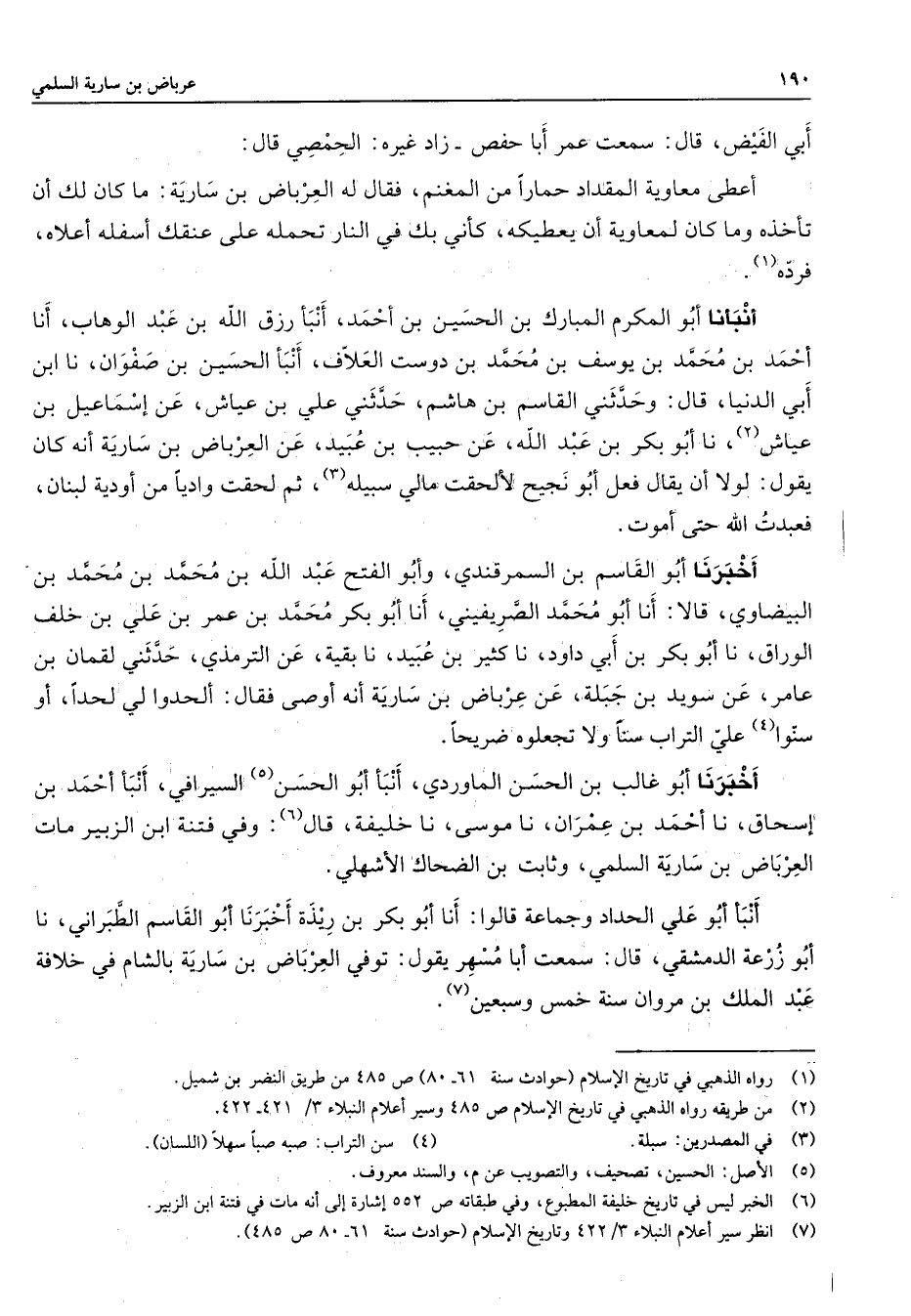 أبي الفيض قال سمعت عمر أبا حفص زاد غيره الحمصي قال أعطى معاوية المقداد حمارا من المغنم فقال له العرباض بن سارية ما كان لك أن تأخذه وما كان لمعاوية أن يعطيكه كأني بك في النار تحمله على عنقك أسفله أعلاه فرده (1) أنبأنا أبو المكرم المبارك بن الحسين بن أحمد أنبأ رزق الله بن عبد الوهاب أنا أحمد بن محمد بن يوسف بن محمد بن دوست العلاف أنبأ الحسين بن صفوان نا ابن أبي الدنيا قال وحدثني القاسم بن هاشم حدثني علي بن عياش عن إسماعيل بن عياش (2) نا أبو بكر بن عبد الله عن حبيب بن عبيد عن العرباض بن سارية أنه كان يقول لولا أن يقال فعل أبو نجيح لألحقت مالي سبيله (3) ثم لحقت واديا من أودية لبنان فعبدت الله حتى أموت أخبرنا أبو القاسم بن السمرقندي وأبو الفتح عبد الله بن محمد بن محمد بن البيضاوي قالا أنا أبو محمد الصريفيني أنا أبو بكر محمد بن عمر بن علي بن خلف الوراق نا أبو بكر بن أبي داود نا كثير بن عبيد نا بقية عن الترمذي حدثني لقمان بن عامر عن سويد بن جبلة عن عرباض بن سارية أنه أوصى فقال ألحدوا لي لحدا أو سنوا (4) علي التراب سنا ولا تجعلوه ضريحا أخبرنا أبو غالب بن الحسن الماوردي أنبأ أبو الحسن (5) السيرافي أنبأ أحمد بن إسحاق نا أحمد بن عمران نا موسى نا خليفة قال (6) وفي فتنة ابن الزبير مات العرباض بن سارية السلمي وثابت بن الضحاك الأشهلي أنبأ أبو علي الحداد وجماعة قالوا أنا أبو بكر بن ريذة أخبرنا أبو القاسم الطبراني نا أبو زرعة الدمشقي قال سمعت أبا مسهر يقول توفي العرباض بن سارية بالشام في خلافة عبد الملك بن مروان سنة خمس وسبعين (7)