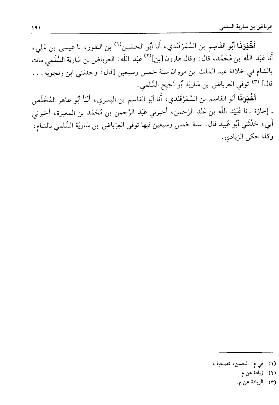 أخبرنا أبو القاسم بن السمرقندي أنا أبو الحسين (1) بن النقور نا عيسى بن علي أنا عبد الله بن محمد قال وقال هارون بن (2) عبد الله العرباض بن سارية السلمي مات بالشام في خلافة عبد الملك بن مروان سنة خمس وسبعين قال وحدثني ابن زنجوية قال (3) توفي العرباض بن سارية أبو نجيح السلمي أخبرنا أبو القاسم بن السمرقندي أنا أبو القاسم بن البسري أنبأ أبو طاهر المخلص إجازة نا عبيد الله بن عبد الرحمن أخبرني عبد الرحمن بن محمد بن المغيرة أخبرني أبي حدثني أبو عبيد قال سنة خمس وسبعين فيها توفي العرباض بن سارية السلمي بالشام وكذا حكى الزيادي