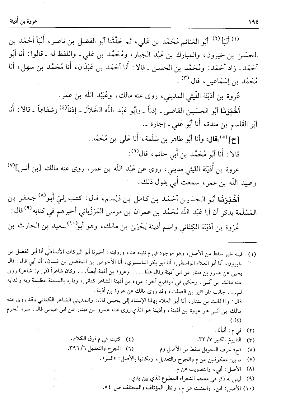(1) أنبأ (2) أبو الغنائم محمد بن علي ثم حدثنا أبو الفضل بن ناصر أنبأ أحمد بن الحسن بن خيرون والمبارك بن عبد الجبار ومحمد بن علي واللفظ له قالوا أنا أبو أحمد زاد أحمد ومحمد بن الحسن قالا أنا أحمد بن عبدان أنا محمد بن سهل أنا محمد بن إسماعيل قال (3) عروة بن أذينة الليثي المديني روى عنه مالك وعبيد الله بن عمر أخبرنا أبو الحسين القاضي إذنا وأبو عبد الله الخلال إذنا (4) وشفاها قالا أنا أبو القاسم بن مندة أنا أبو علي إجازة ح (5) قال وأنا أبو طاهر بن سلمة أنا علي بن محمد قالا أنا أبو محمد بن أبي حاتم قال (6) عروة بن أذينة الليثي مديني روى عن عبد الله بن عمر روى عنه مالك بن أنس (7) وعبيد الله بن عمر سمعت أبي يقول ذلك أخبرنا أبو الحسين أحمد بن كامل بن ديسم قال كتب إلي أبو (8) جعفر بن المسلمة يذكر أن أبا عبد الله محمد بن عمران بن موسى المرزباني أخبرهم في كتابه (9) قال عروة بن أذينة الكناني واسم أذينة يحيى بن مالك وهو أبو (10) سعيد بن الحارث بن