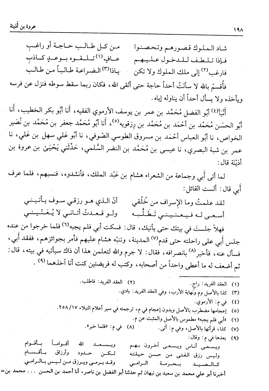 * شاد الملوك قصورهم وتحصنوا * من كل طالب حاجة أو راغب فإذا تلطف للدخول عليهم * عاف (1) تلقوه بوعد كاذب فارغب (2) إلى ملك الملوك ولا تكن * يا ذا (3) الضراعة طالبا من طالب * فأقسم بالله لا سألت أحدا حاجة حتى ألقى الله فكان ربما سقط سوطه فنزل عن فرسه ويأخذه ولا يسأل أحدا أن يناوله إياه أنبأ (4) أبو الفضل محمد بن عمر بن يوسف الأرموي الفقيه أنا أبو بكر الخطيب أنا أبو الحسن محمد بن أحمد بن محمد بن رزقويه (5) أنا أبو محمد جعفر بن محمد بن نصير الخواص نا أبو العباس أحمد بن مسروق الطوسي الصوفي نا أبو علي سهل بن علي نا عمر بن شبة البصري نا عيسى بن محمد بن النضر السلمي حدثني يحيى بن عروة بن أذينة قال لما أتى أبي وجماعة من الشعراء هشام بن عبد الملك فأنشدوه فنسبهم فلما عرف أبي قال ألست القائل * لقد علمت وما الإسراف من خلقي * أن الذي هو رزقي سوف ياتيني * * أسعى له فيعنيني تطلبه * ولو قعدت أتاني لا يعنيني * فهلا جلست في بيتك حتى يأتيك قال فسكت أبي فلم يجبه (6) فلما خرجوا من عنده جلس أبي على راحلته حتى قدم (7) المدينة وتنبه هشام عليهم فأمر بجوائزهم ففقد أبي فسأل عنه فأخبر (8) بإنصرافه فقال لا جرم والله لتعلمن هذا أن ذاك سيأتيه في بيبته قال ثم أضعف له ما أعطى واحدا من أصحابه وكتب له فريضتين كنت أنا آخذهما (9)