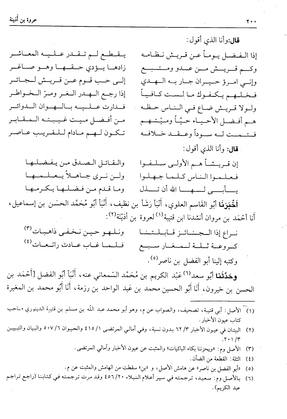 قال وأنا الذي أقول * إذا الفضل يوما عن قريش نظامه * يقطع لم تقدر عليه المعاشر وكم قريش من عدو ومتبع * زادها يؤدي حقها وهو صاغر وإني امرؤ حيران جار به الهدي * إلى حب قوم عن قريش لجائر فخلهم يكفوك ما لست كافيا * إذا رجع الهدر الغر ومر الخواطر ولولا قريش ضاع في الناس حظه * فدارت عليه بالهوان الدوائر هم أفضل الأحياء حيا وميتهم * من أفضل ميت غيبته المقابر فتمت له سودا وعقد خلافه * تكون لهم مادام للقريب عاصر * قال وأنا الذي أقول * إن قريشا هم الأولى سلفوا * والقائل الصدق من يفضلها فعلموا الناس كلها جهلوا * ولن نرى جاهلا يعلمها يأبى لها الله أن تذل * وما قدم من فضلها يكرمها * أخبرنا أبو القاسم العلوي أنبأ رشأ بن نظيف أنبأ أبو محمد الحسن بن إسماعيل أنا أحمد بن مروان أنشدنا ابن قتيبة (1) لعروة بن أذينة * (2) نراع إذا الجنائز قابلتنا * ونلهو حين نخفى ذاهبات (3) كروعة ثلة لمغار سبع * فلما غاب عادت راتعات * (4) وكتبه إلينا أبو الفضل بن ناصر (5) وحدثنا أبو سعد (6) عبد الكريم بن محمد السمعاني عنه أنبأ أبو الفضل أحمد بن الحسن بن خيرون أنا أبو الحسين محمد بن عبد الواحد بن رزمة أنا أبو محمد بن المغيرة