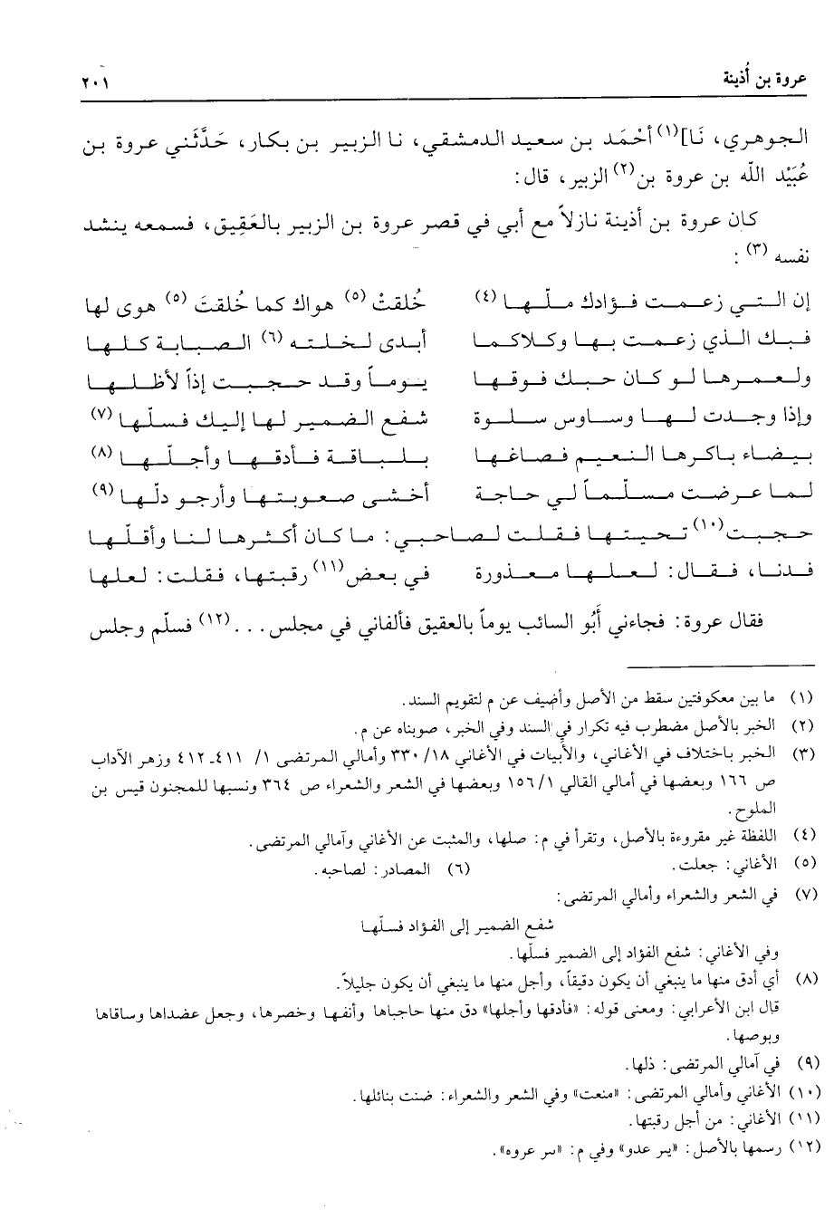 الجوهري نا (1) أحمد بن سعيد الدمشقي نا الزبير بن بكار حدثني عروة بن عبيد الله بن عروة بن (2) الزبير قال كان عروة بن أذينة نازلا مع أبي في قصر عروة بن الزبير بالعقيق فسمعه ينشد نفسه * (3) إن التي زعمت فؤادك ملها * (4) خلقت هواك ما خلقت (5) هوى لها فبك الذي زعمت بها وكلاكما * أبدى لخلته (6) الصبابة كلها ولعمرها لو كان حبك فوقها * يوما وقد حجبت إذا لأظلها وإذا وجدت لها وساوس سلوة * شفع الضمير لها إليك فسلها (7) بيضاء باكرها النعيم فصاغها * بلباقة فأدقها وأجلها (8) لما عرضت مسلما لي حاجة * أخشى صعوبتها وأرجو دلها (9) حجبت (10) تحيتها فقلت لصاحبي * ما كان أكثرها لنا وأقلها فدنا فقال لعلها معذورة * في بعض (11) رقبتها فقلت لعلها * فقال عروة فجاءني أبو السائب يوما بالعقيق فألفاني في مجلس (12) فسلم وجلس