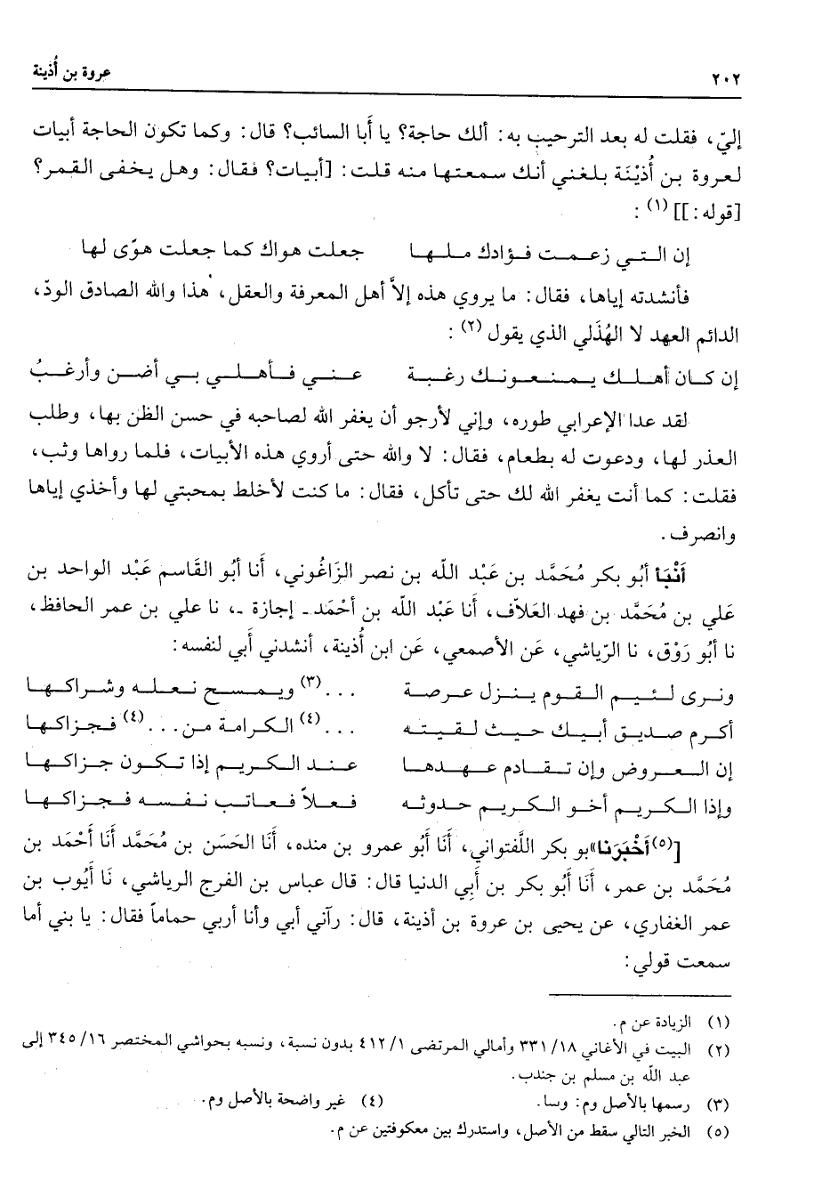 إلي فقلت له بعد الترحيب به ألك حاجة يا أبا السائب قال وكما تكون الحاجة أبيات لعروة بن أذينة بلغني أنك سمعتها منه قلت أبيات فقال وهل يخفى القمر قوله * (1) إن التي زعمت فؤادك ملها * جعلت هواك كما جعلت هوى لها * فأنشدته إياها فقال ما يروي هذه إلى أهل المعرفة والعقل هذا والله الصادق الود الدائم العهد لا الهذلي الذي يقول * (2) إن كان أهلك يمنعونك رغبة * عني فأهلي بي أضن وأرغب * لقد عدا الإعرابي طوره وإني لأرجو أن يغفر الله لصاحبه في حسن الظن بها وطلب العذر لها ودعوت له بطعام فقال لا واللحتى أروي هذه الأبيات فلما رواها وثب فقلت كما أنت يغفر الله لك حتى تأكفقال ما كنت لأخلط بمحبتي لها وأخذي إياها وأنصرف أنبأ أبو بكر محمد بن عبد الله بن نصر الزاغوني أنا أبو القاسم عبد الواحد بن علي بن محمد بن فهد العلاف أنا عبد الله بن أحمد إجازة نا علي بن عمر الحافظ نا أبو روق نا الرياشي عن الأصمعي عن ابن أذنيه أنشدني أبي لنفسه * ونرى لئيم القوم ينزل عرصة * (3) ويمسح نعله وشراكها أكرم صديق أبيك حيث لقتيه * (4) الكرامة من (4) فجزاكها إن العروض وإن تقادم عهدها * عند الكريم إذا تكون جزاكها وإذا الكريم أخو الكريم حدوثه * فعلا فعاتب نفسه فجزاكها * (5) أخبرنا أبو بكر اللفتواني أنا أبو عمرو بن مندة أنا الحسن بن محمد أنا أحمد بن محمد بن عمر أنا أبو بكر بن أبي الدنيا قال قال عباس بن الفرج الرياشي نا أيوب بن عمر الغفاري عن يحيى بن عروة بن أذينة قال رآني أبي وأنا أربي حماما فقال يا بني أما سمعت قولي