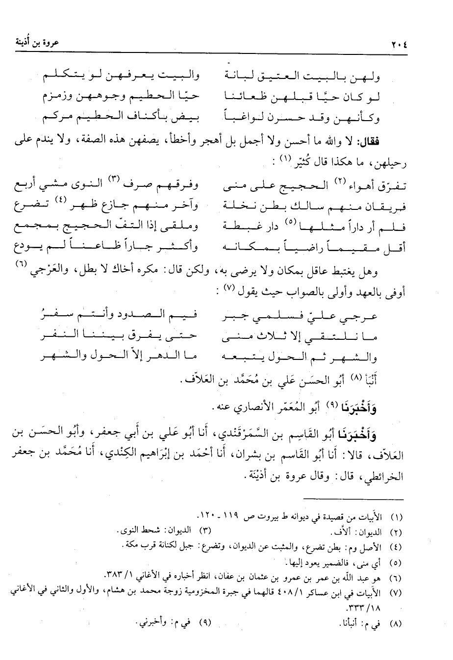ولهن بالبيت العتيق لبانة * والبيت يعرفهن لو يتكلم لو كان حيا قبلهن ظعائنا حيا الحطيم وجوهن وزمزم وكأنهن وقد حسرن لواغبا * بيض بأكناف الحكيم مركم * فقال لا والله ما أحسن ولا أجمل بل أهجر وأخطأ يصفهن هذه الصفة ولا يندم على رحيلهن ما هكذا قال كثير * (1) تفرق أهواء (2) الحجيج على منى * وفرقهم صرف النوى مشي أربع فريقان منهم سالك بطن نخلة * وآخر منهم جازع ظهر (4) تضرع فلم أر دارا مثلها (5) دار غبطة * وملقى إذا التف الحجيج بمجمع أقل مقيما راضيا بمكانه * وأكثر جارا ظاعنا لم يودع * وهل يغتبط عاقل بمكان ولا يرضى به ولكن قال مكره أخاك لا بطل والعرجي (6) أوفى بالعهد وأولى بالصواب حيث يقول * (7) عرجي علي فسلمي جبر * فيم الصدود وأنتم سفر ما نلتقي إلا ثلاث منى * حتى يفرق بيننا النفر والشهر ثم الحول يتبعه * ما الدهر إلا الحول والشهر * أنبأ (8) أبو الحسن علي بن محمد بن العلاف وأخبرنا (9) أبو المعمر الأنصاري عنه وأخبرنا أبو القاسم بن السمرقندي أنا أبو علي بن أبي جعفر وأبو الحسن بن العلاف قالا أنا أبو القاسم بن بشران أنا أحمد بن إبراهيم الكندي أنا محمد بن جعفر الخرائطي قال وقال عروة بن أذينة