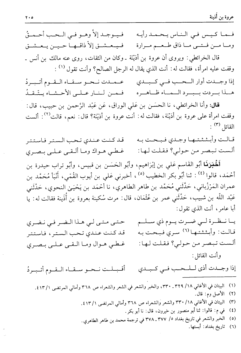 فما كيس في الناس يحمد رأيه * فيوجد إلا وهو في الحب أحمق وما من فتى ما ذاق طعم مرارة * فيعشق إلا ذاقها حين يعشق * قال الخرائطي ويروى أن عروة بن أذينة وكان من الثقات روى عنه مالك بن أنس وقفت عليه امرأة فقالت له أنت الذي قال له الرجل الصالح وأنت تقول (1) * إذا وجدت أوار الحب في كبدي * عمدت نحو سقاء القوم أتبرد هذا بردت ببرد الماء ظاهره * فمن لنار على الأحشاء يتقد * قال وأنا الخرائطي نا الحسن بن علي الوراق عن عبد الرحمن بن حبيب قال وقفت امرأة على عروة بن أذينة فقالت له أنت عروة بن أذينة قال نعم قالت (2) ألست القائل (3) * قالت وأبثثتها وجدي فبحت به * قد كنت عندي تحب الستر فاستتر ألست تبصر من حولي فقلت لها * غطي هواك وما ألقى على بصري * أخبرنا أبو القاسم علي بن إبراهيم وأبو الحسن بن قبيس وأبو تراب حيدرة بن أحمد قالوا ثنا أبو بكر الخطيب (5) أخبرني علي بن أيوب القمي أنبأ محمد بن عمران المرزباني حدثني محمد بن طاهر الطاهري نا أحمد بن يحيى النحوي حدثني عبد الله بن شبيب حدثني عمر بن عثمان قال مرت سكينة بعروة بن أذينة فقالت له يا أبا عامر أنت الذي تقول * يا نظرة لي ضرت يوم ذي سلم * حتى متى لي هذا الضر في نضري قالت وأبثثتها (6) سري فبحت به * قد كنت عندي تحب الستر فاستتر ألست تبصر من حولي فقلت لها * غطي هوال وما ألقى على بصري * وأنت القائل * إذا وجدت أذى للحب في كبدي * أقبلت نحو سقاء القوم أتبرد