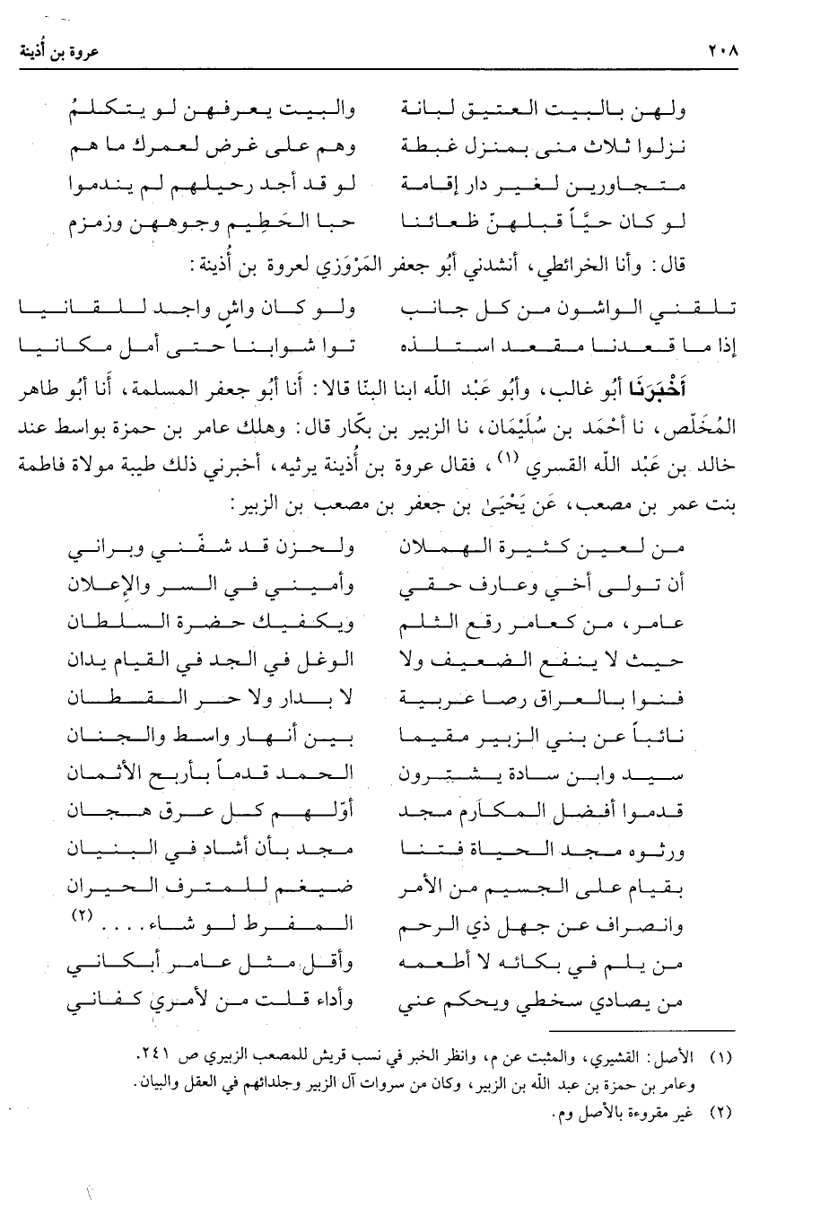 * ولهن بالبيت العتيق لبانة * والبيت يعرفهن لو يتكلم نزلوا ثلاث منى بمنزل غبطة * وهم على غرض لعمرك ما هم متجاورين لغير دار إقامة * لو قد أجد رحيلهم لم يندموا لو كان حيا قبلهن ظعائنا * حبا الحطيم وجوههن وزمزم * قال وأنا الخرائطي أنشدني أبو جعفر المروزي لعروة بن أذينة تلقني الواشون من كل جانب * ولو كان واش واجد للقانيا إذا ما قعدنا مقعد استلذه * توا شوابنا حتى أمل مكانيا * أخبرنا أبو غالب وأبو عبد الله ابنا البنا قالا أنا أبو جعفر المسلمة أنا أبو طاهر المخلص نا أحمد بن سليمان نا الزبير بن بكار قال وهلك عامر بن حمزة بواسط عند خالد بن عبد الله القسري (1) فقال عروة بن أذينة يرثيه أخبرني ذلك طيبة مولاة فاطمة بنت عمر بن مصعب عن يحيى بن جعفر بن مصعب بن الزبير * من لعين كثيرة الهملان * ولحزن قد شفني وبراني أن تولى أخي وعارف حقي * وأميني في السر والإعلان عامر من كعامر رقع الثلم * ويكفيك حضرة السلطان حيث لا ينفع الضعيف ولا * الوغل في الجد في القيام يدان فنوا بالعراق رصا عربية * لا بدار ولا حر القطان نائبا عن بني الزبير مقيما * بين أنهار واسط والجنان سيد وابن سادة يشترون * الحمد قدما بأربح الأثمان قدموا أفضل المكارم مجد * أولهم كل عرق هجان * * ورثوه مجد الحياة فتنا * مجد بأن أشاد في البنيان بقيام على الجسيم من الأمر * ضيغم للمترف الحيران وانصراف عن جهل ذي الرحم * المفرط لو شاء