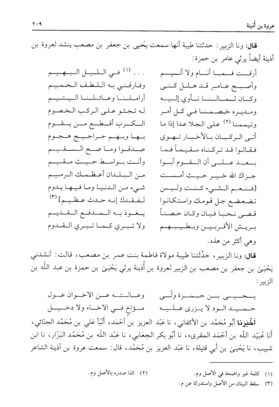 (1) في الليل البهيم وأصبح عامر قد هلل كنى * وفارقني به اللطف الحميم وكان ثمالنا نأوي إليه * أراملنا وعائلنا اليتيم ومديره خصمنا في كل أمر * له تجثو على الركب الخصوم وتيممنا (2) على الجلا عدا إذا ما * الكرب أقطع من يقوم * * أتى الركبان بالأخبار تهوى * بها وبهم حراجيج هجوم فقالوا قد تركناه سقيما فما * صدقوا وما صح السقيم بعد على أن القوم أبوا * وأنت بواسط حيث مقيم جزاك الله خير حيث أمست * من البلدان أعظمك الرميم فنعم الشئ كنت وليس * شئ من الدنيا وما فيها يدوم تضعضع جل قومك واستكانوا * لفقدك إنه حدث عظيم (3) قضى نحبا فبان وكان حصنا * يعوذ به المدفع القديم بريش الأقربين وبطيبهم * ولا تبري كما تبري القدوم * وهي أكثر من هذه قال ونا الزبير حدثتنا طيبة مولاة فاطمة بنت عمر بن مصعب قالت أنشدني يحيى بن جعفر بن مصعب بن الزبير لعروة بن أذينة يرثي يحيى بن حمزة بن عبد الله بن الزبير * يحيى بن حمزة ولى * وعالته عن الإخوان عول حميد الود لا يزرى عليه * مؤاخ في الأخاء ولا دخيل * أخبرنا أبو محمد بن الأكفاني نا عبد العزيز بن أحمد أنبأ علي بن محمد الحنائي أنا عبيد الله بن أحمد المقرئ نا أبو بكر الجعابي نا عبد الله بن محمد البزار نا ابن