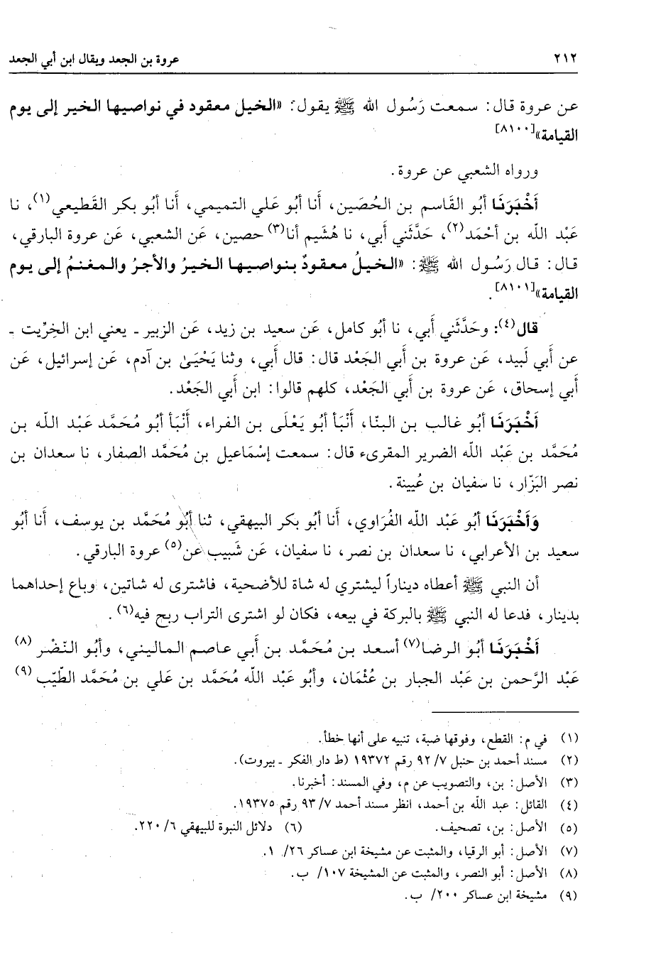 [8100] ورواه الشعبي عن عروة أخبرنا أبو القاسم بن الحصين أنا أبو علي التميمي أنا أبو بكر القطيعي (1) نا عبد الله بن أحمد (2) حدثني أبي نا هشيم أنا (3) حصين عن الشعبي عن عروة البارقي قال قال رسول الله (صلى الله عليه وسلم) الخيل معقود بنواصيها الخير والأجر والمغنم إلى يوم القيامة