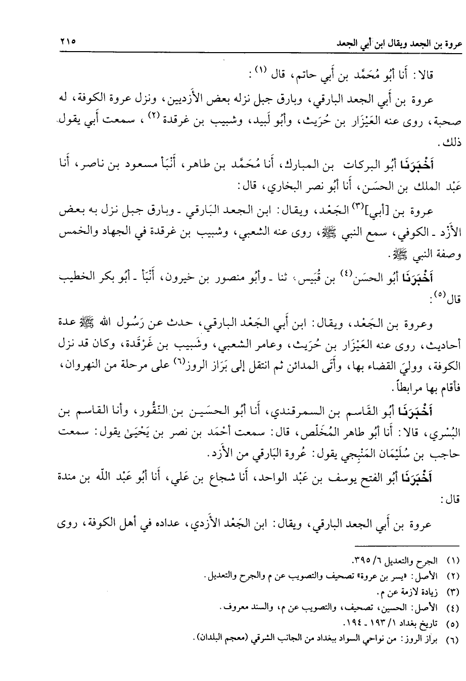 قالا أنا أبو محمد بن أبي حاتم قال (1) عروة بن أبي الجعد البارقي وبارق جبل نزله بعض الأزديين ونزل عروة الكوفة له صحبة روى عنه العيزار بن حريث وأبو لبيد وشبيب بن غرقدة (2) سمعت أبي يقول ذلك أخبرنا أبو البركات بن المبارك أنا محمد بن طاهر أنبأ مسعود بن ناصر أنا عبد الملك بن الحسن أنا أبو نصر البخاري قال عروة بن أبي (3) الجعد ويقال ابن الجعد البارقي وبارق جبل نزل به بعض الأزد الكوفي سمع النبي (صلى الله عليه وسلم) روى عنه الشعبي وشبيب بن غرقدة في الجهاد والخمس وصفه النبي (صلى الله عليه وسلم) أخبرنا أبو الحسن (4) بن قبيس ثنا وأبو منصور بن خيرون أنبأ أبو بكر الخطيب قال (5) وعروة بن الجعد ويقال ان أبي الجعد البارقي حدث عن رسول الله (صلى الله عليه وسلم) عدة أحاديث روى عنه العيزار بن حريث وعامر الشعبي وشبيب بن غرقدة وكان قد نزل الكوفة وولي القضاء بها وأتى المدائن ثم انتقل إلى براز الروز (6) على مرحلة من النهروان فأقابها مرابطا أخبرنا أبو القاسم بن السمرقندي أنا أبو الحسين بن النقور وأنا القاسم بن البسري قالا أنا أبو طاهر المخلص قال سمعت أحمد بن نصر بن يحيى يقول سمعت حاجب بن سليمان المنبجي يقول عروة البارقي من الأزد أخبرنا أبو الفتح يوسف بن عبد الواحد أنا شجاع بن علي أنا أبو عبد الله بن مندة قال عروة بن أبي الجعد البارقي ويقال ابن الجعد الأزدي عداده في أهل الكوفة روى