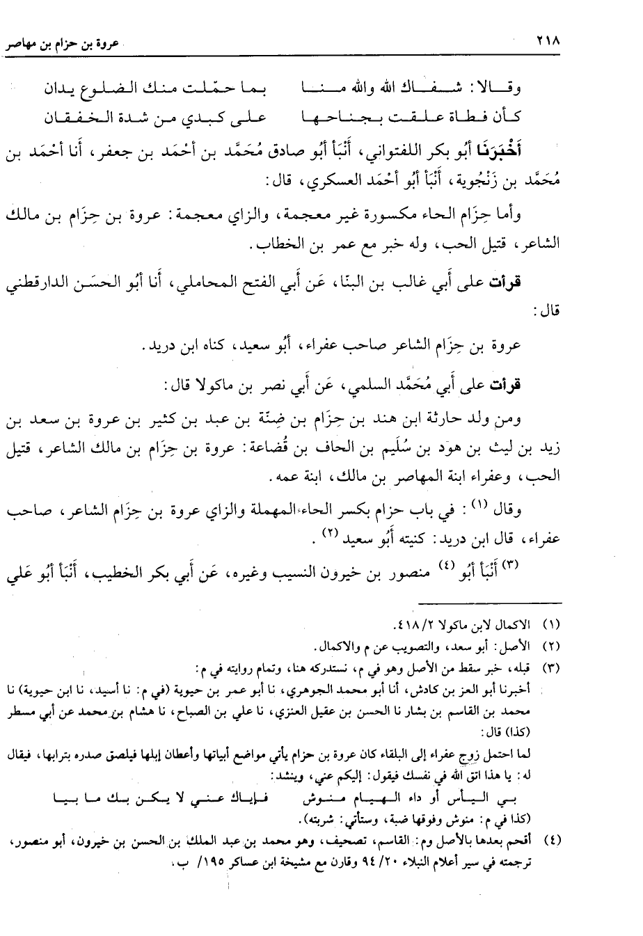 وقالا شفاك الله والله منا * بما حملت منك الضلوع يدان كأن فطاة علقت بجناحها * على كبدي من شدة الخفقان * أخبرنا أبو بكر اللفتواني أنبأ أبو صادق محمد بن أحمد بن جعفر أنا أحمد بن محمد بن زنجوية أنبأ أبو أحمد العسكري قال وأما حزام الحاء مكسورة غير معجمة والزاي معجمة عروة بن حزام بن مالك الشاعر قتيل الحب وله خبر مع عمر بن الخطاب قرأت على أبي غالب بن البنا عن أبي الفتح المحاملي أنا أبو الحسن الدارقطني قال عروة بن حزام الشاعر صاحب عفران أبو سعيد كناه ابن دريد قرأت على أبي محمد السلمي عن أبي نصر بن ماكولا قال ومن ولد حارثة ابن هند بن حزام بن ضنة بن عبد بن كثير بن عروة بن سعد بن زيد بن ليث بن هود بن سليم بن الحاف بن قضاعة عروة بن حزام بن مالك الشاعر قتيل الحب وعفراء ابنة المهاصر بن مالك ابنة عمه وقال (1) في باب حزام بكسر الحاء المهملة والزاي عروة بن حزام الشاعر صاحب عفراء قال ابن دريد كنيته أبو سعيد (2) أنبأ (3) أبو (4) منصور بن خيرون النسيب وغيره عن أبي بكر الخطيب أنبأ أبو علي