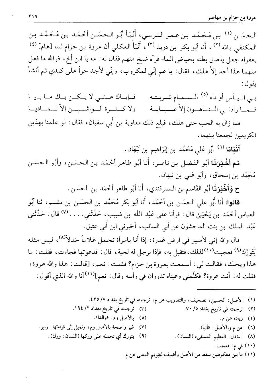 الحسن (1) بن محمد بن عمر النرسي أنبأ أبو الحسن أحمد بن محمد بن المكتفي بالله أنه (2) بكر بن دريد (3) أنبأ العكلي أن عروة بن حزام لما هام (4) بعفراء جعل يلصق بطنه بحياض الماء فرآه شيخ منهم فقال له مه يا بن أخ فوالله ما فعل منهما هذا أحد إلا هلك فقال يا عم إني لمكروب وإني لأجد حرا على كبدي ثم أنشأ يقول * بي اليأس أو داء (5) السمام شربته * فإياك عني لا يكن بك ما بيا فما زادني الناهون إلا صبابة * وكثرة الواشين إلا تماديا * فما زال به الحب حتى هلك فبلغ ذلك معاوية بن أبي سفيان فقال لو علمنا بهذين الكريمين لجمعنا بينهما أنبأنا (6) أبو علي محمد بن إبراهيم بن نبهان ثم أخبرنا أبو الفضل بن ناصر أنا أبو طاهر أحمد بن الحسن وأبو الحسن محمد بن إسحاق وأبو علي بن نبهان ح وأخبرنا أبو القاسم بن السمرقندي أنا أبو طاهر أحمد بن الحسن قالوا أنا أبو علي الحسن بن أحمد أنا أبو بكر محمد بن الحسن بن مقسم ثنا أبو العباس أحمد بن يحيى قال قرأنا على عبد الله بن شبيب حدثني (7) قال حدثني عبد الملك بن بنت الماجشون عن أبي السائب أخبرني ابن أبي عتيق قال والله إني لأسير في أرض غدرة إذا أنا بامرأة تحمل غلاما خدلا (8) ليس مثله يتورك (9) فعجبت (10) لذلك فتقبل به فإذا برجل له لحية قال فدعوتها فجاءت فقلت ما هذا ويحك فقالت لي أسمعت بعروة بن حزام فقلت نعم قالت هذا والله عروة فقلت له أنت عروة فكلمني وعيناه تدوران في رأسه وقال نعم (11) أنا والله الذي أقول
