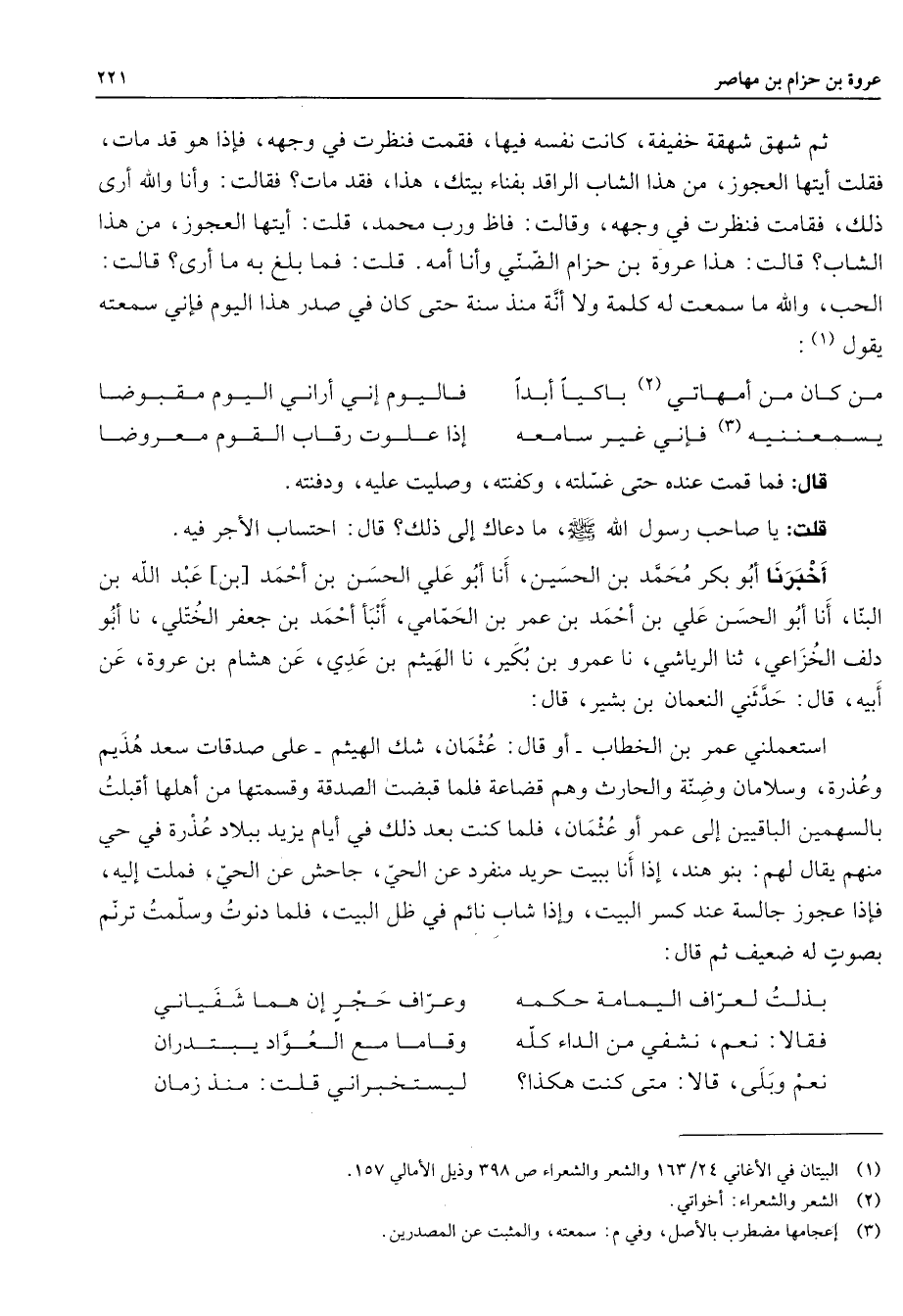 * ثم شهق شهقة خفيفة كانت نفسه فيها فقمت فنظرت في وجهه فإذا هو قد مات فقلت أيتها العجوز من هذا الشاب الراقد بفناء بيتك هذا فقد مات فقالت وأنا والله أرى ذلك فقامت فنظرت في وجهه وقالت فاظ ورب محمد قلت أيتها العجوز من هذا الشاب قالت هذا عروة بن حزام الضني وأنا أمه قلت فما بلغ به ما أرى قالت الحب والله ما سمعت له كلمة ولا أنه منذ سنة حتى كان في صدر هذا اليوم فإني سمعته يقول (1) * من كان من أمهاتي (2) باكيا أبدا * فاليوم إني أراني اليوم مقبوضا يسمعننيه (3) فإني غير سامعه * إذا علوت رقاب القوم معروضا * قال فما قمت عنده حتى غسلته وكفنته وصليت عليه ودفنته قلت يا صاحب رسول الله (صلى الله عليه وسلم) ما دعاك إلى ذلك قال احتساب الأجر فيه أخبرنا أبو بكر محمد بن الحسين أنا أبو علي الحسن بن أحمد بن عبد الله بن البنا أنا أبو الحسن علي بن أحمد بن عمر بن الحمامي أنبأ أحمد بن جعفر الختلي نا أبو دلف الخزاعي ثنا الرياشي نا عمرو بن بكير نا الهيثم بن عدي عن هشام بن عروة عن أبيه قال حدثني النعمان بن بشير قال استعملني عمر بن الخطاب أو قال عثمان شك الهيثم على صدقات سعد هذيم وعذرة وسلامان وضنه والحارث وهم قضاعة فلما قبضت الصدقة وقسمتها من أهلها أقبلت بالسهمين الباقيين إلى عمر أو عثمان فلما كنت بعد ذلك في أيام يزيد ببلاد عذرة في حي منهم يقال لهم بنو هند إذا أنا ببيت حريد منفرد عن الحي جاحش عن الحي فملت إليه فإذا عجوز جالسة عند كسر البيت وإذا شاب نائم في ظل البيت فلما دنوت وسلمت ترنم بصوت له ضعيف ثم قال * بذلت لعراف اليمامة حكمه * وعراف حجر إن هما شفياني فقالا نعم نشفي من الداء كله * وقاما مع العواد يبتدران نعم وبلى قالا متى كنت هكذا * ليستخبراني قلت منذ زمان