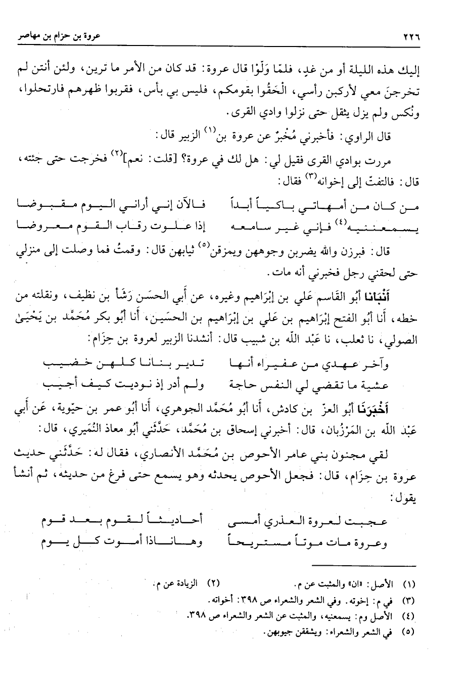 إليك هذه الليلة أو من غد فلما ولوا قال عروة قد كان من الأمر ما ترين ولئن أنتن لم تخرجن معي لأركبن رأسي الحقوا بقومكم فليس بي بأس فقربوا ظهرهم فارتحلوا ونكس ولم يزل يثقل حتى نزلوا وادي القرى قال الراوي فأخبرني مخبر عن عروة بن (1) الزبير قال مررت بوادي القرى فقيل لي هل لك في عروة قلت نعم (2) فخرجت حتى جئته قال فالتفت إلى إخوانه (3) فقال * من كان من أمهاتي باكيا أبدا * فالآن إني أراني اليوم مقبوضا يسمعننيه (4) فإني غير سامعه * إذا علوت رقاب القوم معروضا * قال فبرزن والله يضربن وجوههن ويمزقن (5) ثيابهن قال وقمت فما وصلت إلى منزلي حتى لحقني رجل فخبرني أنه مات أنبأنا أبو القاسم علي بن إبراهيم وغيره عن أبي الحسن رشأ بن نظيف ونقلته من خطه أنا أبو الفتح إبراهيم بن علي بن إبراهيم بن الحسين أنا أبو بكر محمد بن يحيى الصولي نا ثعلب نا عبد الله بن شبيب قال أنشدنا الزبير لعروة بن حزام * وآخر عهدي من عفيراء أنها * تدير بنانا كلهن خضيب عشية ما تقضي لي النفس حاجة * ولم أدد إذ نوديت كيف أجيب * أخبرنا أبو العز بن كادش أنا أبو محمد الجوهري أنا أبو عمر بن حيوية عن أبي عبد الله بن المرزبان قال أخبرني إسحاق بن محمد حدثني أبو معاذ النميري قال لقي مجنون بني عامر الأحوص بن محمد الأنصاري فقال له حدثني حديث عروة بن حزام قال فجعل الأحوص يحدثه وهو يسمع حتى فرغ من حديثه ثم أنشأ يقول * عجبت لعروة العذري أمسى * أحاديثا لقوم بعد قوم وعروة مات موتا مستريحا * وهاناذا أموت كل يوم