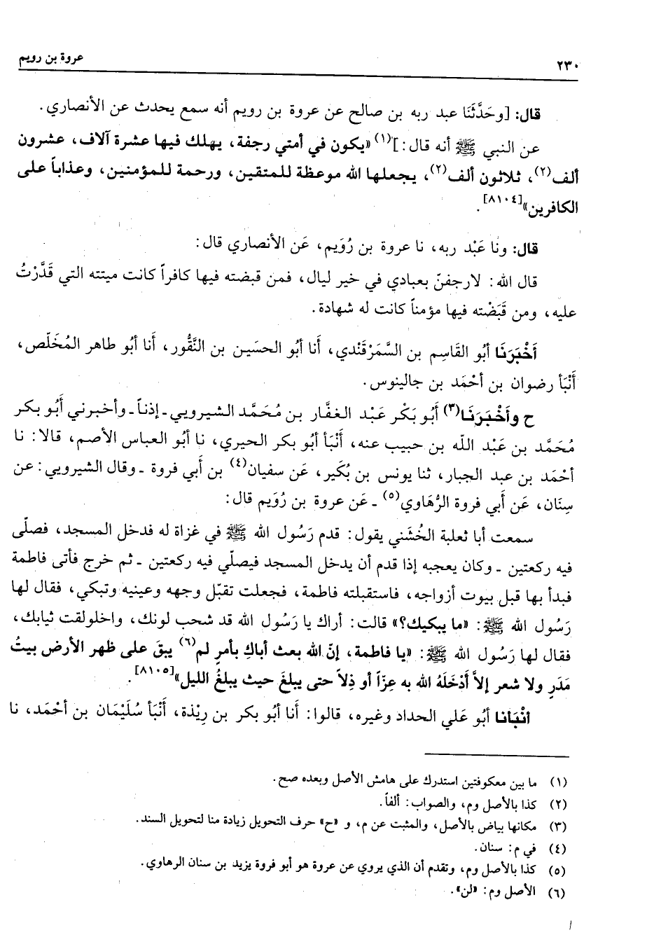 قال وحدثنا عبد ربه بن صالح عن عروة بن رويم أنه سمع يحدث عن الأنصاري عن النبي (صلى الله عليه وسلم) أنه قال (1) يكون في أمتي رجفة يهلك فيها عشرة آلاف عشرون ألف ثلاثون ألف (2) يجعلها الله موعظة للمتقين ورحمة للمؤمنين وعذابا على الكافرين