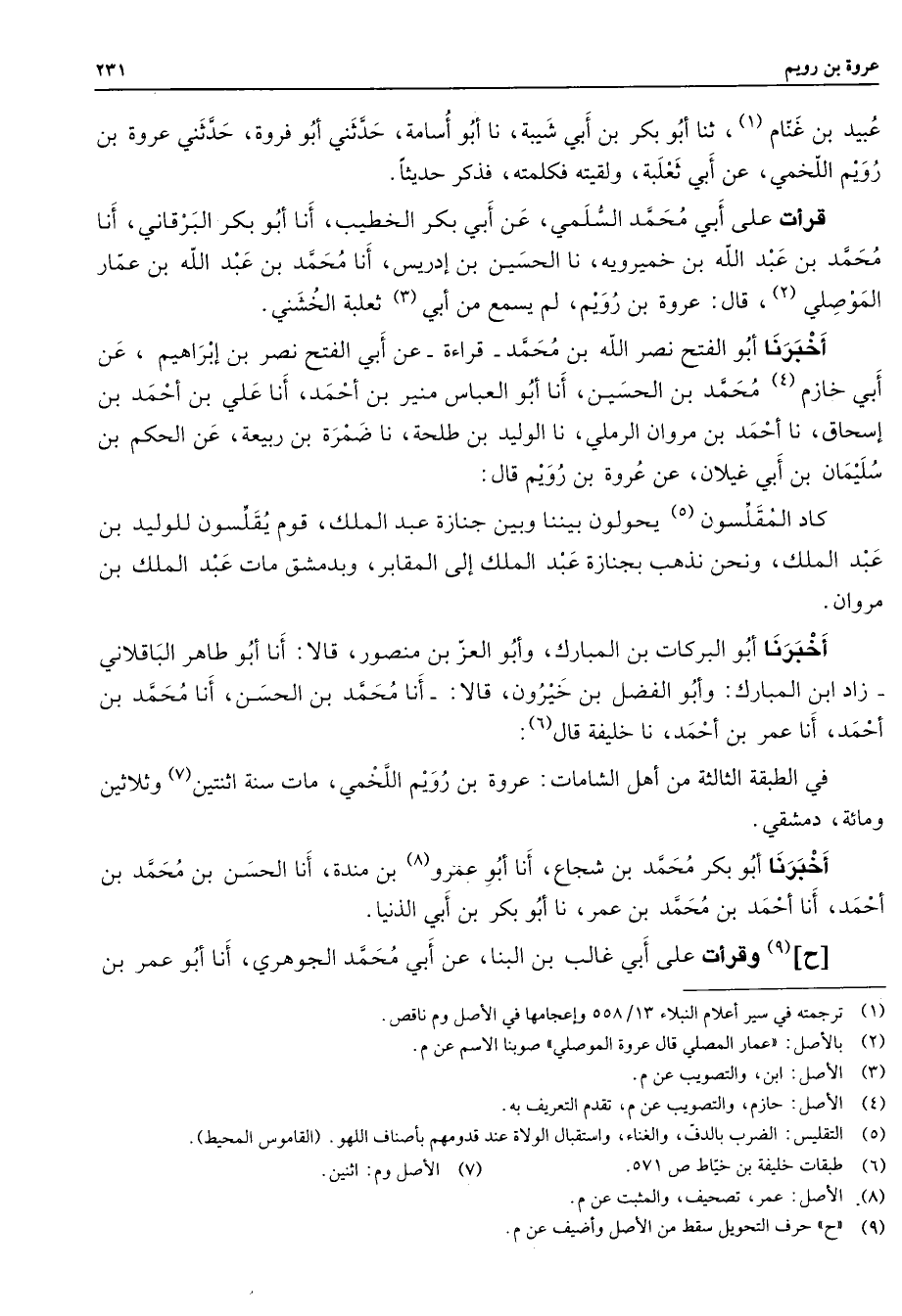 عبيد بن غنام (1) ثنا أبو بكر بن ابي شيبة نا أبو أسامة حدثني أبو فروة حدثني عروة بن رويم اللخمي عن أبي ثعلبة ولقيته فكلمته فذكر حديثا قرأت على أبي محمد السلمي عن أبي بكر الخطيب أنا أبو بكر البرقاني أنا محمد بن عبد الله بن خميرويه نا الحسين بن إدريس أنا محمد بن عبد الله بن عمار الموصلي (2) قال عروة بن رويم لم يسمع من أبي (3) ثعلبة الخشني أخبرنا أبو الفتح نصر الله بن محمد قراءة عن أبي الفتح نصر بن إبراهيم عن أبي خازم (4) محمد بن الحسين أنا أبو العباس منير بن أحمد أنا علي بن أحمد بن إسحاق نا أحمد بن مروان الرملي نا الوليد بن طلحة نا ضمرة بن ربيعة عن الحكم بن سليمان بن أبي غيلان عن عروة بن رويم قال كاد المقلسون (5) يحولون بيننا وبين جنازة عبد الملك قوم يقلسون للوليد بن عبد الملك ونحن نذهب بجنازة عبد الملك إلى المقابر وبدمشق مات عبد الملك بن مروان أخبرنا أبو البركات بن المبارك وأبو العز بن منصور قالا أنا أبو طاهر الباقلاني زاد ابن المبارك وأبو الفضل بن خيرون قالا أنا محمد بن الحسن أنا محمد بن أحمد أنا عمر بن أحمد نا خليفة قال (6) في الطبقة الثالثة من أهل الشامات عروة بن رويم اللخمي مات سنة اثنتين (7) وثلاثين ومائة دمشقي أخبرنا أبو بكر محمد بن شجاع أنا أبو عمرو (8) بن مندة أنا الحسن بن محمد بن أحمد أنا أحمد بن محمد بن عمر نا أبو بكر بن أبي الدنيا ح وقرأت على أبي غالب بن البنا عن أبي محمد الجوهري أنا أبو عمر بن