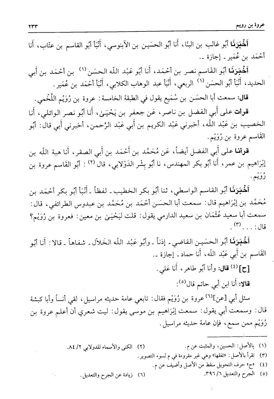 أخبرنا أبو غالب بن النبا أنا أبو الحسين بن الآبنوسي أنبأ أبو القاسم بن عتاب أنا أحمد بن عمير إجازة أخبرنا أبو القاسم نصر بن أحمد أنا أبو عبد الله الحسن (1) بن أحمد بن أبي الحديد أنبأ أبو الحسن (1) الربعي أنبأ عبد الوهاب الكلابي أنبأ أحمد بن عمير قال سمعت أبا الحسن بن سميع يقول في الطبقة الخامسة عروة بن رويم اللخمي قرأت على أبي الفضل بن ناصر عن جعفر بن يحيى أنا أبو نصر الوائلي أنا الخصيب بن عبد الله أخبرني عبد الكريم بن أبي عبد الرحمن أخبرني أبي قال أبو القاسم عروة بن رويم قرأنا على أبي الفضل أيضا عن محمد بن أحمد بن أبي الصقر أنا هبة الله بن إبراهيم بن عمر أنا أبو بكر المهندس نا أبو بشر الدولابي قال (2) أبو القاسم عروة بن رويم أخبرنا أبو القاسم الواسطي ثنا أبو بكر الخطيب لفظا أنبأ أبو بكر أحمد بن محمد بن إبراهيم قال سمعت أبا الحسن أحمد بن محمد بن عبدوس الطرائفي قال سمعت أبا سعيد عثمان بن سعيد الدارمي يقول قلت ليحيى بن معين فعروة بن رويم قال (3) أخبرنا أبو الحسين القاضي إذنا وأبو عبد الله الخلال شفاها قالا أنا أبو القاسم بن أبي عبد الله أنا حماد إجازة ح (4) قال وأنا أبو طاهر أنا علي قالا أنا ابن أبي حاتم قال (5) سئل أبي عن (6) عروة بن رويم فقال تابعي عامة حديثه مراسيل لقي أنسا وأبا كبشة قال وسمعت أبي يقول سمعت إبراهيم بن موسى يقول ليت شعري أن أعلم عروة بن رويم ممن سمع فإن عامة حديثه مراسيل