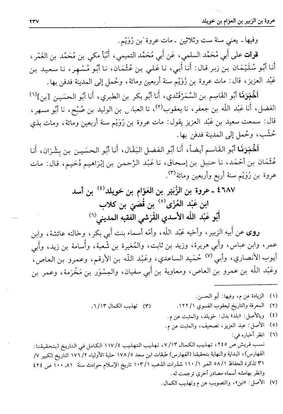 4687 - عروة بن الزبير بن العوام بن خويلد (4) بن أسد بن عبد العزى (5) بن قصي بن كلاب أبو عبد الله الأسدي القرشي الفقيه المديني (6) روى عن أبيه الزبير وأخيه عبد الله وأمه أسماء بنت أبي بكر وخالته عائشة وابن عمر وابن عباس وأبي هريرة وزيد بن ثابت والمغيرة بن شعبة وأسامة بن زيد وأبي أيوب الأنصاري وأبي (7) حميد الساعدي وعبد الله بن الأرقم وعمرو بن العاص وعبد الله بن عمرو بن العاص ومعاوية بن أبي سفيان والمسور بن مخرمة وعمر بن