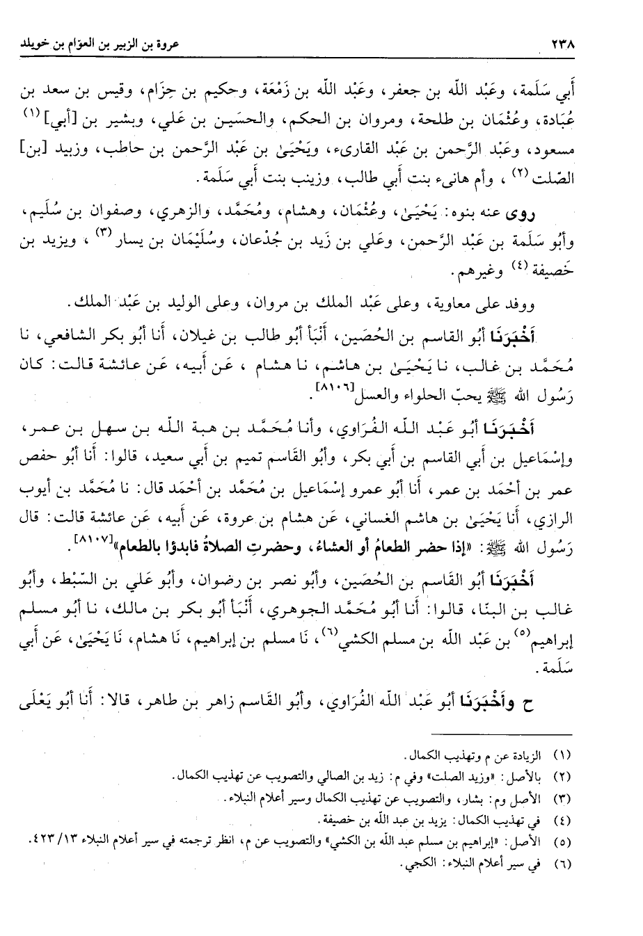 أبي سلمة وعبد الله بن جعفر وعبد الله بن زمعة وحكيم بن حزام وقيس بن سعد بن عبادة وعثمان بن طلحة ومروان بن الحكم والحسين بن علي وبشير بن أبي (1) مسعود وعبد الرحمن بن عبد القارئ ويحيى بن عبد الرحمن بن حاطب وزبيد بن الصلت وأم هانئ بنت أبي طالب وزينب بنت أبي سلمة روى عنه بنوه يحيى وعثمان وهشام ومحمد والزهري وصفوان بن سليم وأبو سلمة بن عبد الرحمن وعلي بن زيد بن جدعان وسليمان بن يسار (3) ويزيد بن خصيفة (4) وغيرهم ووفد على معاوية وعلى عبد الملك بن مروان وعلى الوليد بن عبد الملك أخبرنا أبو القاسم بن الحصين أنبأ أبو طالب بن غيلان أنا أبو بكر الشافعي أنا محمد بن غالب نا يحيى بن هاشم نا هشام عن أبيه عن عائشة قالت كان رسول الله (صلى الله عليه وسلم) يحب الحلواء والعسل