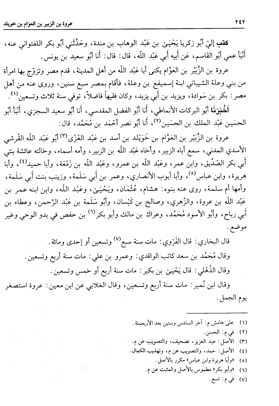 كتب إلي أبو زكريا يحيى بن عبد الوهاب بن مندة وحدثني أبو بكر اللفتواني عنه أنبأ عمي أبو القاسم عن أبيه أبي عبد الله قال قال أنا أبو سعيد بن يونس عروة بن الزبير بن العوام يكنى أبا عبد الله من أهل المدينة قدم مصر وتزوج بها امرأة من بني وعلة الشيباني ابنة إسميفع بن وعلة فاقام بمصر سبع سنين وروى عنه من أهل مصر بكر بن سوادة ويزيد بن أبي يزيد وكان فقيها فاضلا توفي سنة ثلاث وتسعين (1) أخبرنا أبو البركات الأنماطي أنا أبو الفضل المقدسي أنا أبو سعيد السجزي أنبأ أبو الحسين عبد الملك بن الحسين (2) أنا أبو نصر أحمد بن محمد قال عروة بن الزبير بن العوام بن خويلد بن أسد بن عبد العزى (3) أبو عبد الله القرشي الأسدي المدني سمع أباه الزبير وأخاه عبد الله بن الزبير وأمه أسماء وخالته عائشة بنتي أبي بكر الصديق وابن عمر وعبد الله بن عمرو وعبد الله بن زمعة وأبا حميد (4) وأبا هريرة وابن عباس (5) وأبا أيوب الأنصاري وعمر بن أبي سلمة وزينب بنت أبي سلمة وأمها أم سلمة روى عنه بنوه هشام عثمان ويحيى وعبد الله وابن ابنه عمر بن عبد الله بن عروة والزهري وصالح بن كيسان وأبو سلمة بن عبد الرحمن وعطاء بن أبي رباح وأبو الأسود محمد وعراك بن مالك وأبو بكر (6) بن حفص في بدو الوحي وغير موضع قال البخاري قال الفروي مات سنة سبع (7) وتسعين أو إحدى ومائة وقال محمد بن سعد كاتب الواقدي وعمرو بن علي مات سنة أربع وتسعين وقال الذهلي قال يحيى بن بكير مات سنة أربع أو خمس وتسعين وقال ابن نمير مات سنة أربع وتسعين وقال الغلابي عن ابن معين عروة استصغر يوم الجمل