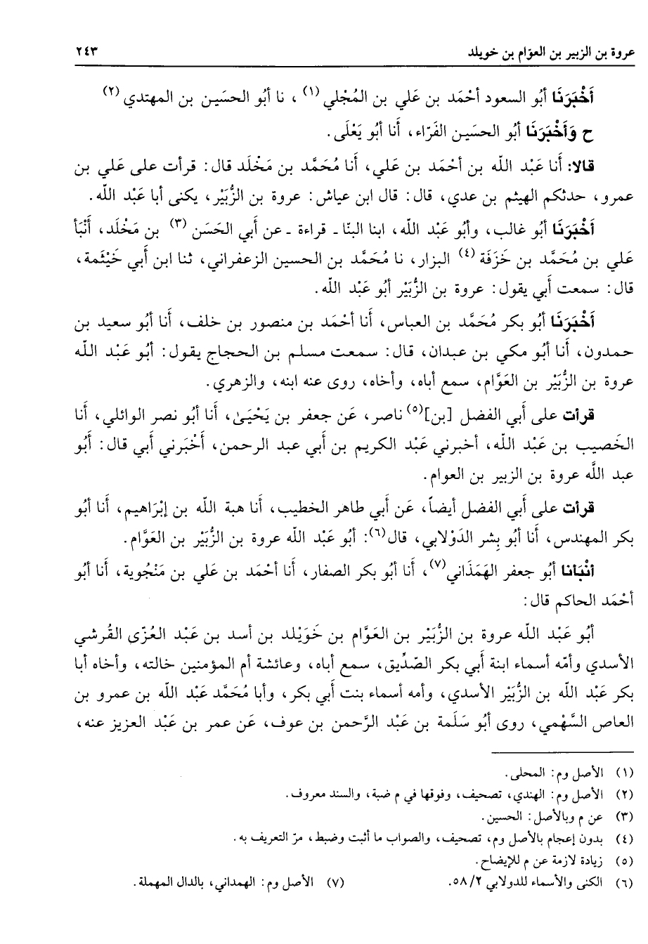 أخبرنا أبو السعود أحمد بن علي بن المجلي (1) نا أبو الحسين بن المهتدي (2) ح وأخبرنا أبو الحسين الفراء أنا أبو يعلى قالا أنا عبد الله بن أحمد بن علي أنا محمد بن مخلد قال قرأت على علي بن عمرو حدثكم الهيثم بن عدي قال قال ابن عياش عروة بن الزبير يكنى أبا عبد الله أخبرنا أبو غالب وأبو عبد الله ابنا البنا قراءة عن أبي الحسن (3) بن مخلد أنبأ علي بن محمد بن خزفة (4) البزار نا محمد بن الحسين الزعفراني ثنا ابن أبي خيثمة قال سمعت أبي يقول عروة بن الزبير أبو عبد الله أخبرنا أبو بكر محمد بن العباس أنا أحمد بن منصور بن خلف أنا أبو سعيد بن حمدون أنا أبو مكي بن عبدان قال سمعت مسلم بن الحجاج يقول أبو عبد الله عروة بن الزبير بن العوام سمع أباه وأخاه روى عنه ابنه والزهري قرأت على أبي الفضل بن (5) ناصر عن جعفر بن يحيى أنا أبو نصر الوائلي أنا الخصيب بن عبد الله أخبرني عبد الكريم بن أبي عبد الرحمن أخبرني أبي قال (6) أبو عبد الله عروة بن الزبير بن العوام قرأت على أبي الفضل أيضا عن أبي طاهر الخطيب أنا هبة الله بن إبراهيم أنا أبو بكر المهندس أنا أبو بشر الدولابي (7) قال أبو عبد الله عروة بن الزبير بن العوام أنبأنا أبو جعفر الهمذاني أنا أبو بكر الصفار أنا أحمد بن علي بن منجوية أنا أبو أحمد الحاكم قال أبو عبد الله عروة بن الزبير بن العوام بن خويلد بن أسد بن عبد العزى القرشي الأسدي وأمه أسماء ابنة أبي بكر الصديق سمع أباه وعائشة أم المؤمنين خالته وأخاه أبا بكر عبد الله بن الزبير الأسدي وأمه أسماء بنت أبي بكر وأبا محمد عبد الله بن عمرو بن العاص السهمي روى أبو سلمة بن عبد الرحمن بن عوف عن عمر بن عبد العزيز عنه