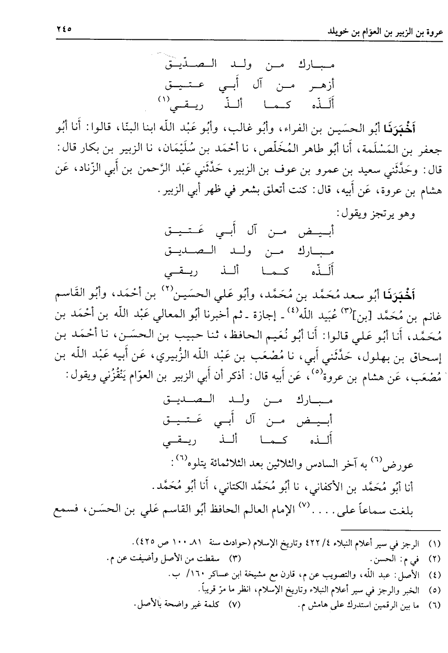 * مبارك من ولد الصديق * أزهر من آل ابي عتيق * ألذه كما ألذ ريقي (1) أخبرنا أبو الحسين بن الفراء وأبو غالب وأبو عبد الله ابنا البنا قالوا أنا أبو جعفر بن المسلمة أنا أبو طاهر المخلص نا أحمد بن سليمان أنا الزبير بن بكار قال قال وحدثني سعيد بن عمرو بن عوف بن الزبير حدثني عبد الرحمن بن أبي الزناد عن هشام بن عروة عن أبيه قال كنت أتعلق بشعر في ظهر أبي الزبير وهو يرتجز ويقول * أبيض من آل أبي عتيق * مبارك من ولد الصديق * ألذه كما ألذ ريقي أخبرنا أبو سعد محمد بن محمد وأبو علي الحسين (2) بن أحمد وأبو القاسم غانم بن محمد بن (3) عبيد الله (4) إجازة ثم أخبرنا أبو المعالي عبد الله بن أحمد بن محمد أنا أبو علي قالوا أنا أبو نعيم الحافظ ثنا حبيب بن الحسن نا أحمد بن إسحاق بن بهلول حدثني أبي نا مصعب بن عبد الله الزبيري عن أبيه عبد الله بن مصعب عن هشام بن عروة (5) عن أبيه قال أذكر أن أبي الزبير بن العوام ينقزني ويقول * مبارك من ولد الصديق * أبيض من آل أبي عتيق * ألذه كما ألذ ريقي عورض به آخر السادس والثلاثين بعد الثلاثمائة يتلوه (6) أنا أبو محمد بن الأكفاني نا أبو محمد الكتاني أنا أبو محمد بلغت سماعا على