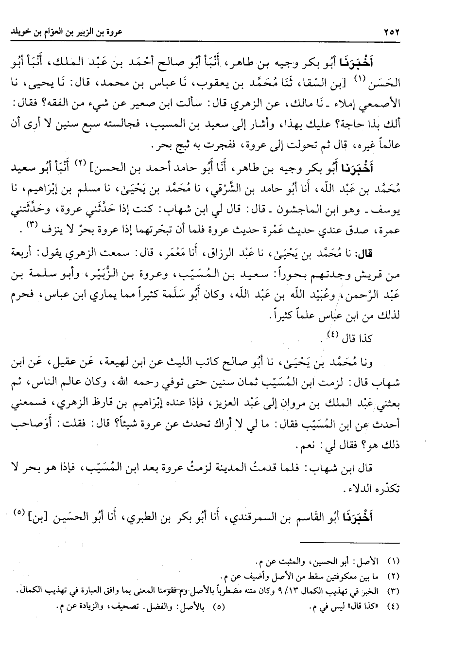 أخبرنا أبو بكر وجيه بن طاهر أنبأ أبو صالح أحمد بن عبد الملك أنبأ أبو الحسن (1) بن السقا ثنا محمد بن يعقوب نا عباس بن محمد قال نا يحيى نا الأصمعي إملاء نا مالك عن الزهري قال سألت ابن صعير عن شئ من الفقه فقال ألك بذا حاجة عليك بهذا وأشار إلى سعيد بن المسيب فجالسته سبع سنين لا أرى أن عالما غيره قال ثم تحولت إلى عروة ففجرت به ثبج بحر أخبرنا أبو بكر وجيه بن طاهر أنا أبو حامد أحمد بن الحسن (2) أنبأ أبو سعيد محمد بن عبد الله أنا أبو حامد بن الشرقي نا محمد بن يحيى نا مسلم بن إبراهيم نا يوسف وهو ابن الماجشون قال قال لي ابن شهاب كنت إذا حدثني عروة وحدثتني عمرة صدق عندي حديث عمرة حديث عروة فلما أن تبحرتهما إذا عروة بحر لا ينزف (3) قال نا محمد بن يحيى نا عبد الرزاق أنا معمر قال سمعت الزهري يقول أربعة من قريش وجدتهم بحورا سعيد بن المسيب وعروة بن الزبير وأبو سلمة بن عبد الرحمن وعبيد الله بن عبد الله وكان أبو سلمة كثيرا مما يماري ابن عباس فحرم لذلك من ابن عباس علما كثيرا كذا قال (4) ونا محمد بن يحيى نا أبو صالح كاتب الليث عن ابن لهيعة عن عقيل عن ابن شهاب قال لزمت ابن المسيب ثمان سنين حتى توفي رحمه الله وكان عالم الناس ثم بعثني عبد الملك بن مروان إلى عبد العزيز فإذا عنده إبراهيم بن قارظ الزهري فسمعني أحدث عن ابن المسيب فقال ما لي لا أراك تحدث عن عروة شيئا قال فقلت أو صاحب ذلك هو فقال لي نعم قال ابن شهاب فلما قدمت المدينة لزمت عروة بعد ابن المسيب فإذا هو بحر لا تكدره الدلاء أخبرنا أبو القاسم بن السمرقندي أنا أبو بكر بن الطبري أنا أبو الحسين بن