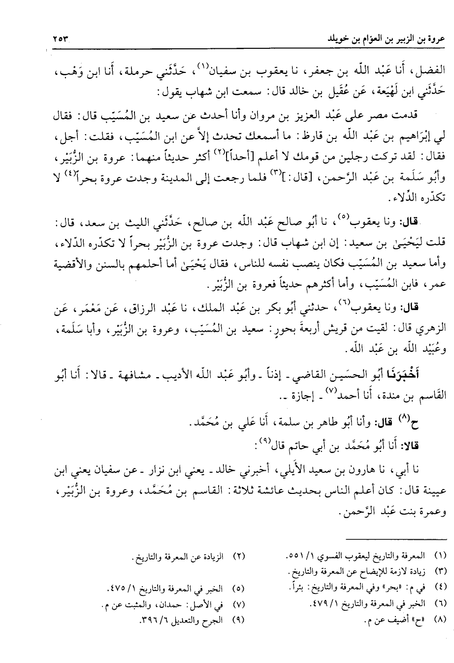 الفضل أنا عبد الله بن جعفر نا يعقوب بن سفيان (1) حدثني حرملة أنا ابن وهب حدثني ابن لهيعة عن عقيل بن خالد قال سمعت ابن شهاب يقول قدمت مصر على عبد العزيز بن مروان وأنا أحدث عن سعيد بن المسيب قال فقال لي إبراهيم بن عبد الله بن قارظ ما أسمعك تحدث إلا عن ابن المسيب فقلت أجل فقال لقد تركت رجلين من قومك لا أعلم أحدا (2) أكثر حديثا منهما عروة بن الزبير وأبو سلمة بن عبد الرحمن قال (3) فلما رجعت إلى المدينة وجدت عروة بحرا (4) لا تكدره الدلاء قال ونا يعقوب (5) نا أبو صالح عبد الله بن صالح حدثني الليث بن سعد قال قلت ليحيى بن سعيد إن ابن شهاب قال وجدت عروة بن الزبير بحرا لا تكدره الدلاء وأما سعيد بن المسيب فكان ينصب نفسه للناس فقال يحيى أما أحلمهم بالسنن والأقضية عمر فابن المسيب وأما أكثرهم حديثا فعروة بن الزبير قال ونا يعقوب (6) حدثني أبو بكر بن عبد الملك نا عبد الرزاق عن معمر عن الزهري قال لقيت من قريش أربعة بحور سعيد بن المسيب وعروة بن الزبير وأبا سلمة وعبيد الله بن عبد الله أخبرنا أبو الحسين القاضي إذنا وأبو عبد الله الأديب مشافهة قالا أنا أبو القاسم بن مندة أنا أحمد (7) إجازة ح (8) قال وأنا أبو طاهر بن سلمة أنا علي بن محمد قالا أنا أبو محمد بن أبي حاتم قال (9) نا أبي نا هارون بن سعيد الأيلي أخبرني خالد يعني ابن نزال عن سفيان يعني ابن عيينة قال كان أعلم الناس بحديث عائشة ثلاثة القاسم بن محمد وعروة بن الزبير وعمرة بنت عبد الرحمن