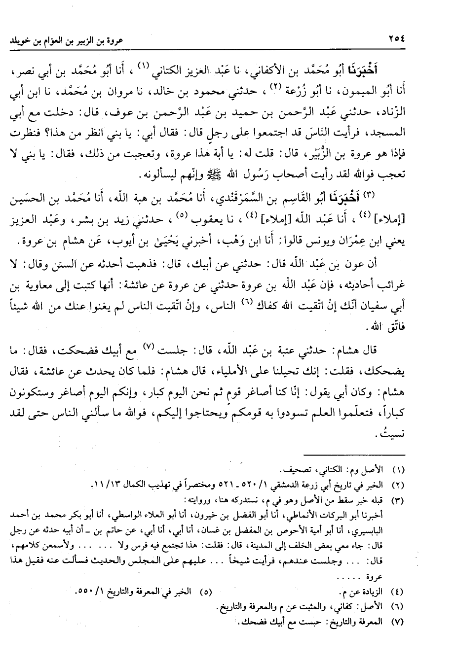 أخبرنا أبو محمد بن الأكفاني نا عبد العزيز الكتاني (1) أنا أبو محمد بن أبي نصر أنا أبو الميمون نا أبو زرعة (2) حدثني محمود بن خالد نا مروان بن محمد نا ابن أبي الزناد حدثني عبد الرحمن بن حميد بن عبد الرحمن بن عوف قال دخلت مع أبي المسجد فرأيت الناس قد اجتمعوا على رجل قال فقال أبي يا بني انظر من هذا فنظرت فإذا هو عروة بن الزبير قال قلت له يا أبة هذا عروة وتعجبت من ذلك فقال يا بني لا تعجب فوالله لقد رأيت أصحاب رسول الله (صلى الله عليه وسلم) وإنهم ليسألونه (3) أخبرنا أبو القاسم بن السمرقندي أنا محمد بن هبة الله أنا محمد بن الحسين إملاء (4) أنا عبد الله إملاء (4) نا يعقوب (5) حدثني زيد بن بشر وعبد العزيز يعني ابن عمران ويونس قالوا أنا ابن وهب أخبرني يحيى بن أيوب عن هشام بن عروة أن عون بن عبد الله قال حدثني عن أبيك قال فذهبت أحدثه عن السنن وقال لا غرائب أحاديثه فإن عبد الله بن عروة حدثني عن عروة عن عائشة أنها كتبت إلى معاوية بن أبي سفيان أنك إن اتقيت الله كفاك (6) الناس وإن اتقيت الناس لم يغنوا عنك من الله شيئا فاتق الله قال هشام حدثني عتبة بن عبد الله قال جلست (7) مع أبيك فضحكت فقال ما يضحكك فقلت إنك تحيلنا على الأملياء قال هشام فلما كان يحدث عن عائشة فقال هشام وكان أبي يقول إنا كنا أصاغر قوم ثم نحن اليوم كبار وإنكم اليوم أصاغر وستكونون كبارا فتعلموا العلم تسودوا به قومكم ويحتاجوا إليكم فوالله ما سألني الناس حتى لقد نسيت