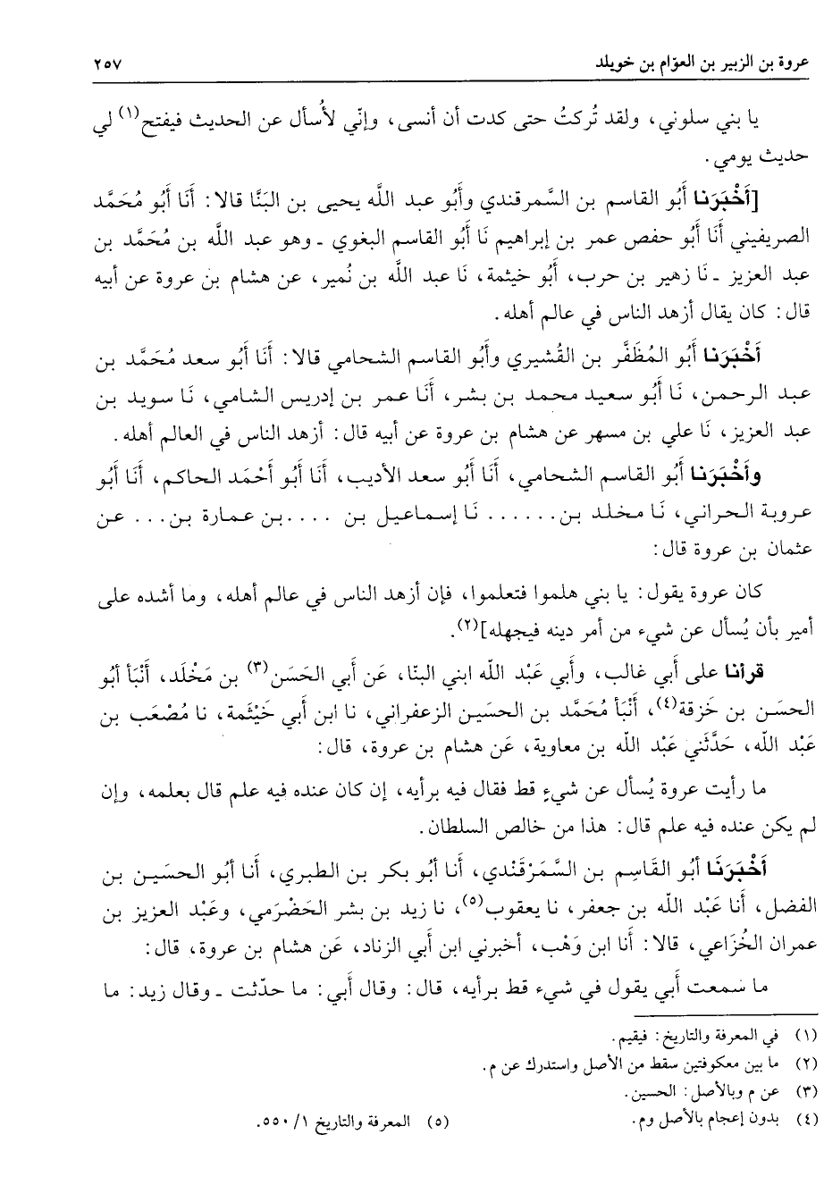 يا بني سلوني ولقد تركت حتى كدت أن أنسى وإني لأسأل عن الحديث فيفتح (1) لي حديث يومي أخبرنا أبو القاسم بن السمرقندي وأبو عبد الله يحيى بن البنا قالا أنا أبو محمد الصريفيني أنا أبو حفص عمر بن إبراهيم أنا أبو القاسم البغوي وهو عبد الله بن محمد بن عبد العزيز نا زهير بن حرب أبو خيثمة نا عبد الله بن نمير عن هشام بن عروة عن أبيه قال كان يقال أزهد الناس في عالم أهله أخبرنا أبو المظفر بن القشيري وأبو القاسم الشحامي قالا أنا أبو سعد محمد بن عبد الرحمن نا أبو سعيد محمد بن بشر أنا عمر بن إدريس الشامي نا سويد بن عبد العزيز نا علي بن مسهر عن هشام بن عروة عن أبيه قال أزهد الناس في العالم أهله وأخبرنا أبو القاسم الشحامي أنا أبو سعد الأديب أنا أبو أحمد الحاكم أنا أبو عروبة الحراني نا مخلد بن نا إسماعيل بن بن عمارة بن عن عثمان بن عروة قال كان عروة يقول يا بني هلموا فتعلموا فإن أزهد الناس في عالم أهله وما أشده على أمير بأن يسأل عن شئ من أمر دينه فيجهله (2) قرأنا على أبي غالب وأبي عبد الله ابني البنا عن أبي الحسن (3) بن مخلد أنبأ أبو الحسن بن خزقة (4) أنبأ محمد بن الحسين الزعفراني نا ابن أبي خيثمة نا معصب بن عبد الله حدثني عبد الله بن معاوية عن هشام بن عروة قال ما رأيت عروة يسأل عن شئ قط فقال فيه برأيه إن كان عنده فيه علم قال بعلمه وإن لم يكن عنده فيه علم قال هذا من خالص السلطان أخبرنا أبو القاسم بن السمرقندي أنا أبو بكر بن الطبري أنا أبو الحسين بن الفضل أنا عبد الله بن جعفر نا يعقوب نا زيد بن بشر الحضرمي وعبد العزيز بن عمران الخزاعي قالا أنا ابن وهب أخبرني ابن أبي الزناد عن هشام بن عروة قال ما سمعت أبي يقول في شئ قط برأيه قال وقال أبي ما حدثت وقال زيد ما