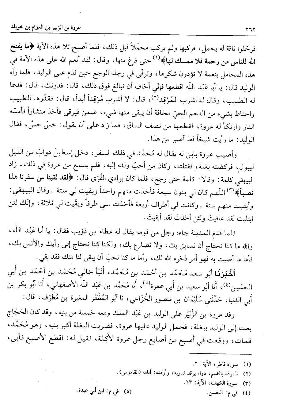 فرحلوا ناقة له يحمل فركبها ولم يركب محملا قبل ذلك فلما أصبح تلا هذه الآية " ما يفتح الله للناس من رحمة فلا ممسك لها " (1) حتى فرغ منها وقال لقد أنعم الله على هذه الأمة في هذه المحامل بنعمة لا تؤدون شكرها وترقى في رجله الوجع حين قدم على الوليد فلما رآه الوليد قال يا أبا عبد الله اقطعها فإني أخاف أن تبالغ فوق ذلك قال فدونك قال فدعا له الطبيب وقال له اشرب المرقد (2) قال لا أشرب مرقدا أبدا قال فقدرها الطبيب واحتاط بشي من اللحم الحي مخافة أن يبقى منها شئ ضمن فيرقى فأخذ منشارا فأمسه النار وارتكأ له عروة فقطعها من نصف الساق فما زاد على أن يقول حس حس فقال الوليد ما رأيت شيخا قط أصبر من هذا وأصيب عروة بابن له يقال له محمد في ذلك السفر دخل إسطبل دواب من الليل ليبول فركضته بغلة فقتلته وكان من أحب ولده إليه فلم يسمع من عروة في ذلك زاد البيهقي كلمة وقالا كلمة حتى رجع فلما كان بوادي القرى قال " لقد لقينا من سفرنا هذا نصبا " (3) اللهم كان لي بنون سبعة فأخذت منهم واحدا وبقيت لي ستة وقال البيهقي وأبقيت منهم ستة وكانت لي أطراف أربعة فأخذت مني طرفا وبقيت لي ثلاثة وإنك لئن ابتليت لقد عافيت ولئن أخذت لقد أبقيت فلما قدم المدينة جاءه رجل من قومه يقال له عطاء بن ذؤيب فقال يا أبا عبد الله والله ما كنا نحتاج أن نسابق بك ولا نصارع بك ولكنا كنا نحتاج إلى رأيك والأنس بك فأما ما أصبت به فهو أمر ذخره الله لك وأما ما كنا نحب أن يبقى لنا منك فقد بقي أخبرنا أبو سعد محمد بن أحمد بن محمد أنبأ خالي محمد بن أحمد بن أبي الحسين (4) أنا أبو سعيد بن أبي عمرة (5) أنا محمد بن عبد الله الأصفهاني أنا أبو بكر بن أبي الدنيا حدثني سليمان بن منصور الخزاعي نا أبو المظفر المغيرة بن مطرف قال وفد عروة بن الزبير على الوليد بن عبد الملك ومعه خمسة من بنيه وقد كان الحجاج بعث إلى الوليد ببغلة فحمل الوليد عليها عروة فضربت البغلة أكبر بنيه وهو محمد فمات ووقعت في أصبع من أصابع رجل عروة الأكلة فقيل له اقطع الإصبع فأبى