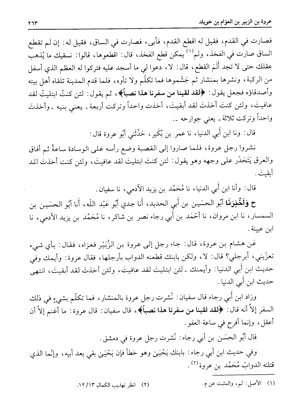 فصارت في القدم فقيل له اقطع القدم فأبى فصارت في الساق فقيل له إن لم تقطع الساق صارت في الفخذ ولم (1) يمكن قطع الفخذ قال اقطعوها قالوا نسقيك ما يذهب عقلك حتى لا تجد ألم القطع قال لا دعوا لي ما أسجد عليه فتركوا له العظم الذي أسفل من الركبة ونشرها بمنشار ثم جشموها فما تكلم ولا تأوه فلما قدم المدينة تلقاه أهل بيته وأصدقاؤه فجعل يقول " لقد لقينا من سفرنا هذا نصبا " ثم يقول لئن كنت ابتليت لقد عافيت ولئن كنت أخذت لقد أبقيت أخذت واحدا وتركت أربعة يعني بنيه وأخذت واحدا وتركت ثلاثة يعني جوارحه قال ونا ابن أبي الدنيا نا عمر بن بكير حدثني أبو عروة قال نشروا رجل عروة فلما صاروا إلى القصبة وضع رأسه على الوسادة ساعة ثم أفاق والعرق يتحدر على وجهه وهو يقول لئن كنت ابتليت لقد عافيت ولئن كنت أخذت لقد أبقيت قال وأنا ابن أبي الدنيا نا محمد بن يزيد الآدمي نا سفيان ح وأخبرنا أبو الحسين بن أبي الحديد أنا جدي أبو عبد الله أنا أبو الحسين بن السمسار نا ابن مروان نا أحمد بن أبي رجاء بن شاكر نا محمد بن يزيد الآدمي نا ابن عيينة عن هشام بن عروة قال جاء رجل إلى عروة بن الزبير فعزاه فقال بأي شئ تعزيني أبرجلي قال لا ولكن بإبنك قطعنه الدواب بأرجلها فقال عروة وأيمك وفي حديث ابن أبي الدنيا وأيمنك لئن ابتليت لقد عافيت ولئن أخذت لقد أبقيت أنتهى حديث ابن أبي الدنيا وزاد ابن أبي رجاء قال سفيان نشرت رجل عروة بالمنشار فما تكلم بشئ في ذلك السفر إلا أنه قال " لقد لقينا من سفرنا هذا نصبا " قال سفيان قال عروة ما أغنم إلا أن أعقل وإنما أفرح في ساعة العفو قال أبو الحسن بن أبي رجاء نشرت رجل عروة في دمشق وفي حديث ابن أبي رجاء بإبنك يحيى وهو خطأ فإن يحيى بقي بعد أبيه وإنما الذي قتلته الدواب محمد بن عروة (2)