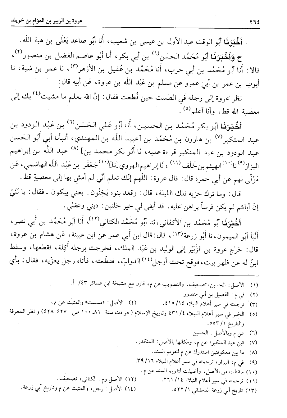أخبرنا أبو الوقت عبد الأول بن عيسى بن شعيب أنا أبو صاعد يعلى بن هبة الله ح وأخبرنا أبو محمد الحسن (1) بن أبي بكر أنا أبو عاصم الفضل بن منصور (2) قالا أنا أبو محمد بن أبي حرب أنا محمد بن عقيل بن الأزهر (3) نا عمر بن شبة نا أيوب بن عمر بن أبي عمرو عن مسلم بن عبد الله بن عروة عن أبيه قال نظر عروة إلى رجله في الطست حين قطعت فقال إن الله يعلم ما مشيت (4) بك إلى معصية الله قط وأنا أعلم (5) أخبرنا أبو بكر محمد بن الحسين أنا أبو علي الحسن (6) بن عبد الودود بن عبد المتكبر (7) بن هارون بن محمد بن عبيد الله بن المهتدي أنبأنا أبي أبو الحسن عبد الودود بن عبد المتكبر قراءة عليه أنا أبو بكر محمد بن (8) عبد الله بن إبراهيم البزاز (9) نا الهيثم بن (10) خلف (11) نا إبراهيم الهروي نا (10) جعفر بن عبد الله الهاشمي عن مولى لهم عن أبي حمزة قال قال عروة اللهم إنك تعلم أني لم أمش بها إلى معصية قط قال وما ترك حزبه تلك الليلة قال وقعد بنوه يخنون يعني يبكون فقال يا بني إن أباكم لم يكن فرسا يراهن عليه قد أبقى لي خير خلتين ديني وعقلي أخبرنا أبو محمد بن الأكفاني ثنا أبو محمد الكتاني (12) أنا أبو محمد بن أبي نصر أنبأ أبو الميمون نا أبو زرعة (13) قال قال ابن أبي عمر عن ابن عيينة عن هشام بن عروة قال خرج عروة بن الزبير إلى الوليد بن عبد الملك فخرجت برجله أكلة فقطعها وسقط ابن له عن ظهر بيت فوقع تحت أرجل (14) الدواب فقطعته فأتاه رجل يعزيه فقال بأي