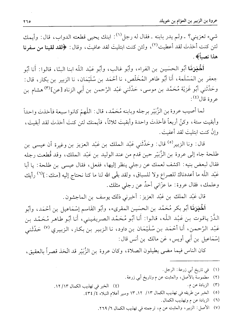 شئ تعزيني ولم يدر بإبنه فقال له رجل (1) ابنك يحيى قطعته الدواب قال وأيمك لئن كنت أخذت لقد أعطيت (2) ولئن كنت أبتليت لقد عافيت وقال " لقد لقينا من سفرنا هذا نصبا " أخبرنا أبو الحسين بن الفراء وأبو غالب وأبو عبد الله ابنا البنا قالوا أنا أبو جعفر بن المسلمة أنا أبو طاهر المخلص نا أحمد بن سليمان نا الزبير بن بكار قال وحدثني أبو غزية محمد بن موسى حدثني عبد الرحمن بن أبي الزناد عن (3) هشام بن عروة قال (4) لما أصيب عروة بن الزبير برجله وبابنه محمد قال اللهم كانوا سبعة فأخذت واحدا وابقيت ستة وكن أربعا فأخذت واحدة وأبقيت ثلاثا فأيمنك لئن كنت أخذت لقد أبقيت وإن كنت ابتليت لقد أعفيت قال ونا الزبير (5) قال وحدثني عبد الملك بن عبد العزيز بن وغيرة أن عيسى بن طلحة جاء إلى عروة بن الزبير حين قدم من عند الوليد بن عبد الملك وقد قطعت رجله فقال لبعض بنيه اكشف لعمك عن رجلي ينظر إليها ففعل فقال عيسى بن طلحة يا أبا عبد الله ما أعددناك للصراع ولا للسباق ولقد ابقى الله لنا ما كنا نحتاج إليه منك (6) رأيك وعلمك فقال عروة ماعزاني أحد عن رجلي مثلك قال عبد الملك بن عبد العزيز أخبرني ذلك يوسف بن الماجشون أخبرنا أبو بكر محمد بن الحسين المقرئ وأبو القاسم إسماعيل بن أحمد وأبو الدر ياقوت بن عبد الله قالوا أنا أبو محمد الصريفيني أنا أبو طاهر محمد بن عبد الرحمن أنا أحمد بن سليمان بن داود نا الزبير بن بكار الزبيري (7) حدثني إسماعيل بن أبي أويس عن مالك بن أنس قال كان الناس فيما مضى يطيلون الصلاة وكان عروة بن الزبير قد اتخذ قصرا بالعقيق