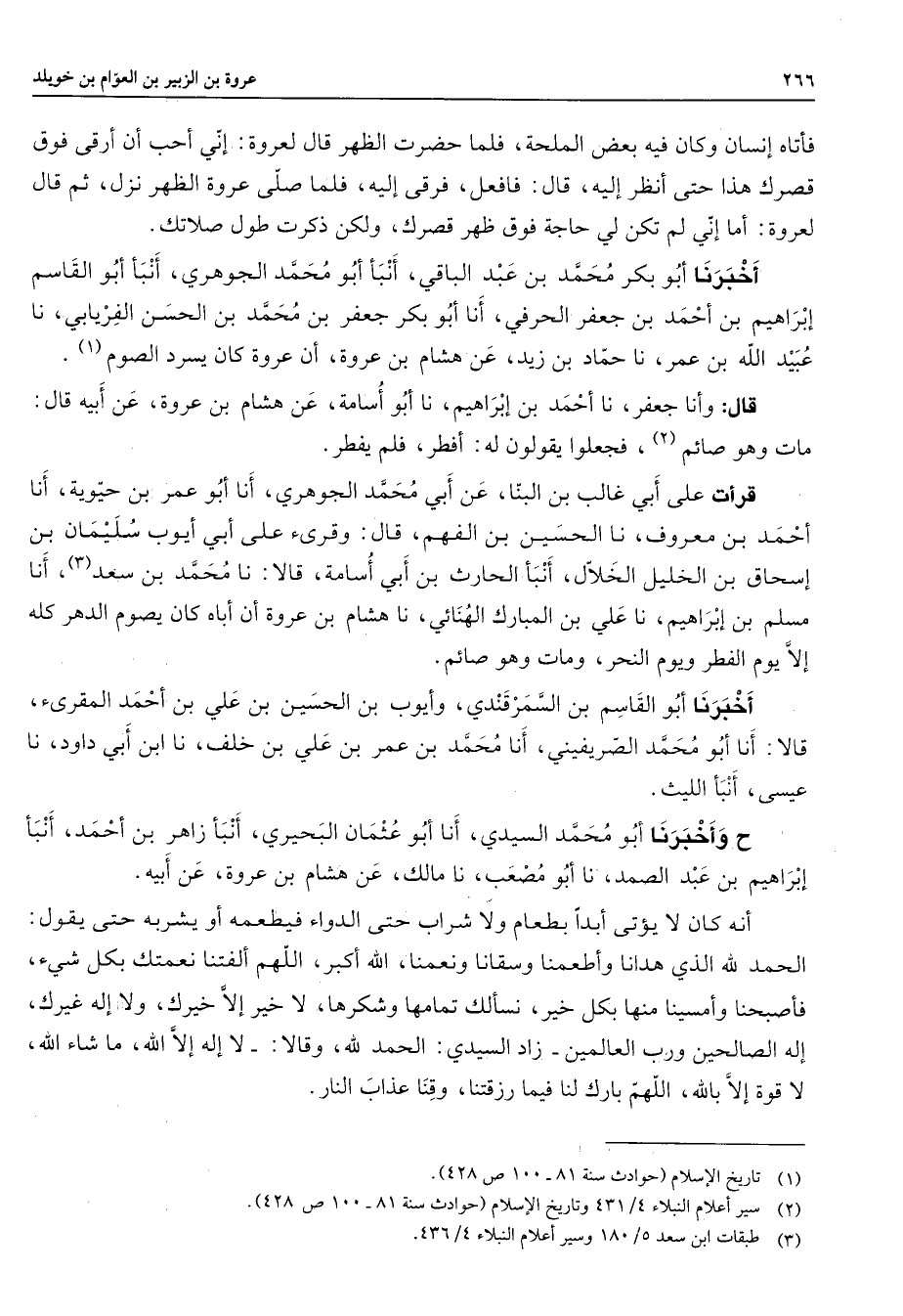 فأتاه إنسان وكان فيه بعض الملحة فلما حضرت الظهر قال لعروة إني أحب أن أرقي فوق قصرك هذا حتى أنظر إليه قال فافعل فرقى إليه فلما صلى عروة الظهر نزل ثم قال لعروة أما إني لم تكن لي حاجة فوق ظهر قصرك ولكن ذكرت طول صلاتك أخبرنا أبو بكر محمد بن عبد الباقي أنبأ أبو محمد الجوهري أنبأ أبو القاسم إبراهيم بن أحمد بن جعفر الحرفي أنا أبو بكر جعفر بن محمد بن الحسن الفريابي نا عبيد الله بن عمر نا حماد بن زيد عن هشام بن عروة أن عروة كان يسرد الصوم (1) قال وأنا جعفر نا أحمد بن إبراهيم نا أبو أسامة عن هشام بن عروة عن أبيه قال مات وهو صائم (2) فجعلوا يقولون له أفطر فلم يفطر قرأت على أبي غالب بن البنا عن أبي محمد الجوهري أنا أبو عمر بن حيوية أنا أحمد بن معروف نا الحسين بن الفهم قال وقرئ على أبي أيوب سليمان بن إسحاق بن الخليل الخلال أنبأ الحارث بن أبي أسامة قالا نا محمد بن سعد (3) أنا مسلم بن إبراهيم نا علي بن المبارك الهنائي نا هشام بن عروة أن أباه كان يصوم الدهر كله إلا يوم الفطر ويوم النحر ومات وهو صائم أخبرنا أبو القاسم بن السمرقندي وأيوب بن الحسين بن علي بن أحمد المقرئ قالا أنا أبو محمد الصريفيني أنا محمد بن عمر بن علي بن خلف نا ابن أبي داود نا عيسى أنبأ الليث ح وأخبرنا أبو محمد السيدي أنا أبو عثمان البحيري أنبأ زاهر بن أحمد أنبأ إبراهيم بن عبد الصمد نا أبو مصعب نا مالك عن هشام بن عروة عن ابيه أنه كان لا يؤتى أبدا بطعام ولا شراب حتى الدواء فيطعمه أو يشربه حتى يقول الحمد لله الذي هدانا وأطعمنا وسقانا ونعمنا الله أكبر اللهم ألفتنا نعمتك بكل شئ فأصبحنا وأمسينا منها بكل خير نسالك تمامها وشكرها لا خير إلا خيرك ولا إله غيرك إله الصالحين ورب العالمين زاد السيدي الحمد لله وقالا لا إله إلا الله ما شاء الله لا قوة إلا بالله اللهم بارك لنا فيما رزقتنا وقنا عذاب النار