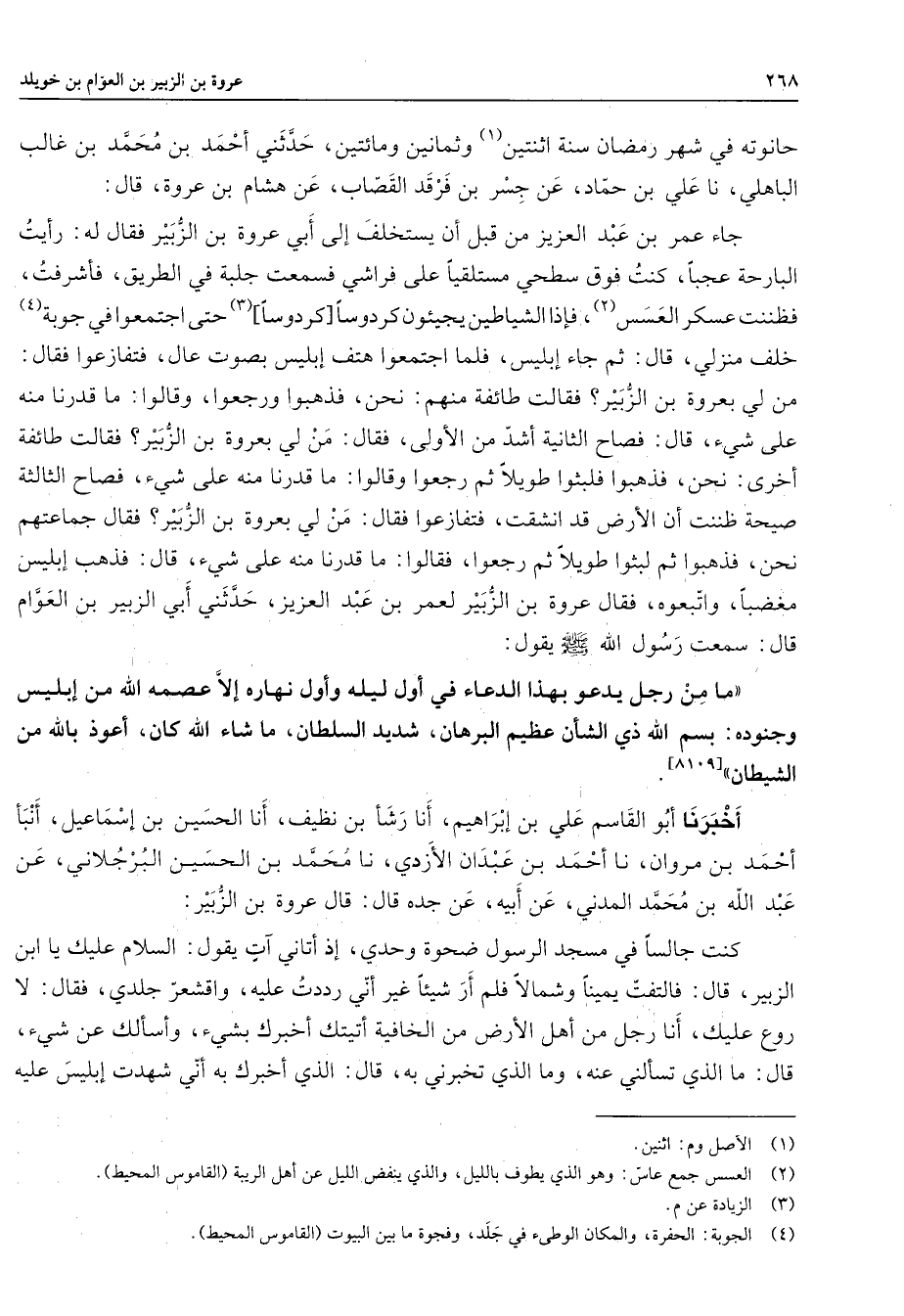 حانوته في شهر رمضان سنة اثنتين (1) وثمانين ومائتين حدثني أحمد بن محمد بن غالب الباهلي نا علي بن حماد عن جسر بن فرقد القصاب عن هشام بن عروة قال جاء عمر بن عبد العزيز من قبل أن يستخلف إلى أبي عروة بن الزبير فقال له رأيت البارحة عجبا كنت فوق سطحي مستلقيا على فراشي فسمعت جلبة في الطريق فأشرفت فظننت عسكر العسس (2) فإذا الشياطين يجيئون كردوسا كردوسا (3) حتى اجتمعوا في جوبة (4) خلف منزلي قال ثم جاء إبليس فلما اجتمعوا هتف إبليس بصوت عال فتفازعوا فقال من لي بعروة بن الزبير فقالت طائفة منهم نحن فذهبوا ورجعوا وقالوا ما قدرنا منه على شئ قال فصاح الثانية أشد منالأولى فقال من لي بعروة بن الزبير فقالت طائفة أخرى نحن فذهبوا فلبثوا طويلا ثم رجعوا وقالوا ما قدرنا منه على شئ فصاح الثالثة صيحة ظننت أن الأرض قد انشقت فتفازعوا فقال من لي بعروة بن الزبير فقال جماعتهم نحن فذهبوا ثم لبثوا طويلا ثم رجعوا فقالوا ما قدرنا منه على شئ قال فذهب إبليس مغضبا وأتبعوه فقال عروة بن الزبير لعمر بن عبد العزيز حدثني أبي الزبير بن العوام قال سمعت رسول الله (صلى الله عليه وسلم) يقول ما من رجل يدعو بهذا الدعاء في أول ليله وأول نهاره إلا عصمه الله من إبليس وجنوده بسم الله ذي الشأن عظيم البرهان شديد السلطان ما شاء الله كان أعوذ بالله من الشيطان