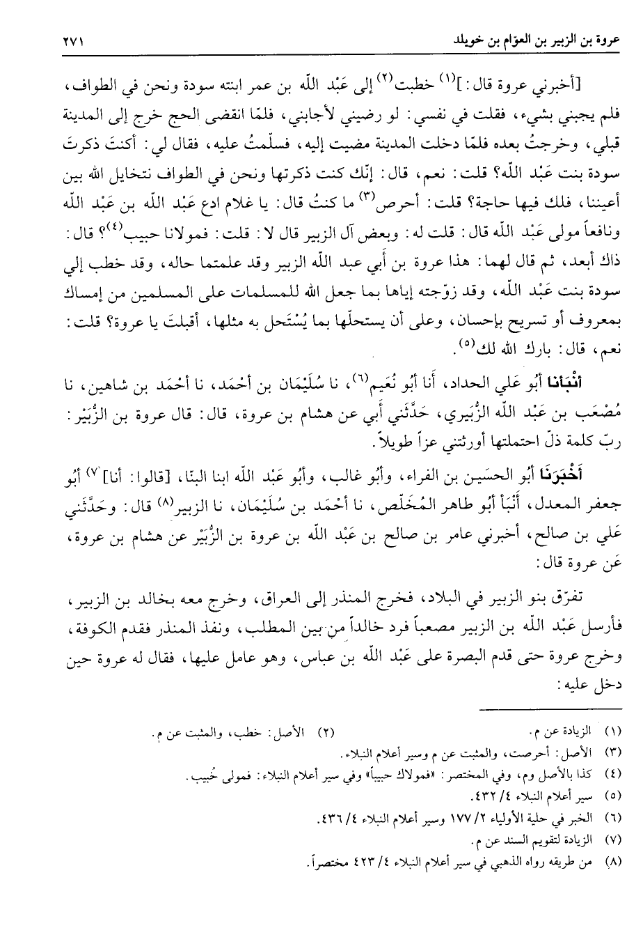 أخبرني عروة قال (1) خطبت (2) إلى عبد الله بن عمر ابنته سودة ونحن في الطواف فلم يجبني بشئ فقلت في نفسي لو رضيني لأجابني فلما انقضى الحج خرج إلى المدينة قبلي وخرجت بعده فلما دخلت المدينة مضيت إليه فسلمت عليه فقال لي أكنت ذكرت سودة بنت عبد الله قلت نعم قال إنك كنت ذكرتها ونحن في الطواف نتخايل الله بين أعيننا فلك فيها حاجة قلت أحرص (3) ما كنت قال يا غلام ادع عبد الله بن عبد الله ونافعا مولى عبد الله قال قلت له وبعض آل الزبير قال لا قلت فمولانا حبيب (4) قال ذاك أبعد ثم قال لهما هذا عروة بن أبي عبد الله الزبير وقد علمتما حاله وقد خطب إلي سودة بنت عبد الله وقد زوجته إياها بما جعل الله للمسلمات على المسلمين من إمساك بمعروف أو تسريح بإحسان وعلى أن يستحلها بما يستحل به مثلها أقبلت يا عروة قلت نعم قال بارك الله لك (5) أنبأنا أبو علي الحداد أنا أبو نعيم (6) نا سليمان بن أحمد نا أحمد بن شاهين نا مصعب بن عبد الله الزبيري حدثني أبي عن هشام بن عروة قال قال عروة بن الزبير رب كلمة ذل احتملتها أورثتني عزا طويلا أخبرنا أبو الحسين بن الفراء وأبو غالب وأبو عبد الله ابنا البنا قالوا أنا (7) أبو جعفر المعدل أنبأ أبو طاهر المخلص نا أحمد بن سليمان نا الزبير (8) قال وحدثني علي بن صالح أخبرني عامر بن صالح بن عبد الله بن عروة بن الزبير عن هشام بن عروة عن عروة قال تفرق بنو الزبير في البلاد فخرج المنذر إلى العراق وخرج معه بخالد بن الزبير فأرسل عبد الله بن الزبير مصعبا فرد خالدا من بين المطلب ونفذ المنذر فقدم الكوفة وخرج عروة حتى قدم البصرة على عبد الله بن عباس وهو عامل عليها فقال له عروة حين دخل عليه