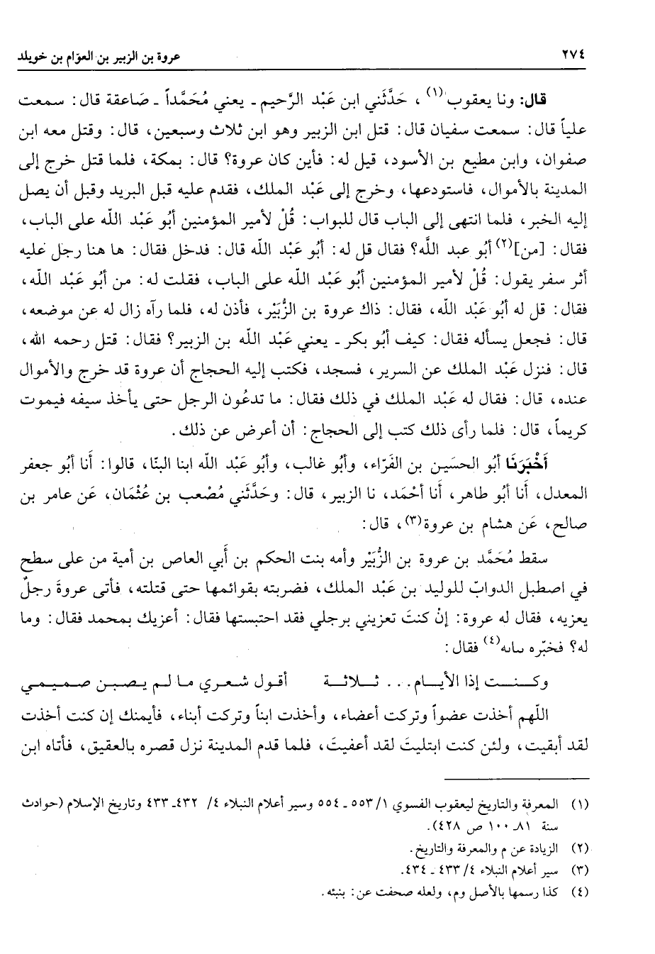 قال ونا يعقوب (1) حدثني ابن عبد الرحيم يعني محمدا صاعقة قال سمعت عليا قال سمعت سفيان قال قتل ابن الزبير وهو ابن ثلاث وسبعين قال وقتل معه ابن صفوان وابن مطيع بن الأسود قيل له فأين كان عروة قال بمكة فلما قتل خرج إلى المدينة بالأموال فاستودعها وخرج إلى عبد الملك فقدم عليه قبل البريد وقبل أن يصل إليه الخبر فلما انتهى إلى الباب قال للبواب قل لأمير المؤمنين أبو عبد الله على الباب فقال من (2) أبو عبد الله فقال قل له أبو عبد الله قال فدخل فقال ها هنا رجل عليه أثر سفر يقول قل لأمير المؤمنين أبو عبد الله على الباب فقلت له من أبو عبد الله فقال قل له أبو عبد الله فقال ذاك عروة بن الزبير فأذن له فلما رآه زال له عن موضعه قال فجعل يسأله فقال كيف أبو بكر يعني عبد الله بن الزبير فقال قتل رحمه الله قال فنزل عبد الملك عن السرير فسجد فكتب إليه الحجاج أن عروة قد خرج والأموال عنده قال فقال له عبد الملك في ذلك فقال ما تدعون الرجل حتى يأخذ سيفه فيموت كريما قال فلما رأى ذلك كتب إلى الحجاج أن أعرض عن ذلك أخبرنا أبو الحسين بن الفراء وأبو غالب وأبو عبد الله ابنا البنا قالوا أنا أبو جعفر المعدل أنا أبو طاهر أنا أحمد نا الزبير قال وحدثني مصعب بن عثمان عن عامر بن صالح عن هشام بن عروة (3) قال سقط محمد بن عروة بن الزبير وأمه بنت الحكم بن أبي العاص بن أمية من على سطح في اصطبل الدواب للوليد بن عبد الملك فضربته بقوائمها حتى قتلته فأتى عروة رجل يعزيه فقال له عروة إن كنت تعزيني برجلي فقد احتبستها فقال أعزيك بمحمد فقال وما له فخبره بابه (4) فقال * وكنت إذا الأيام ثلاثة * أقول شعري ما لم يصبن صميمي * اللهم أخذت عضوا وتركت أعضاء وأخذت ابنا وتركت أبناء فأيمنك إن كنت أخذت لقد أبقيت ولئن كنت أبتليت لقد أعفيت فلما قدم المدينة نزل قصره بالعقيق فأتاه ابن