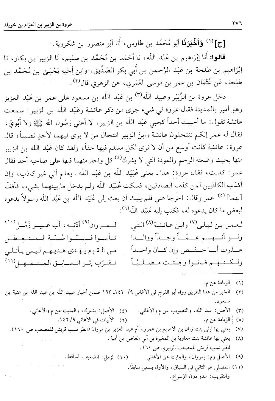ح (1) وأخبرنا أبو محمد بن طاوس أنا أبو منصور بن شكروية قالوا أنا إبراهيم بن عبد الله نا أحمد بن محمد بن سليم نا الزبير بن بكار نا إبراهيم بن طلحة بن عبد الرحمن بن أبي بكر الصديق وابن أخيه يحيى بن محمد بن طلحة عن عثمان بن عمر بن موسى العمري عن الزهري قال (2) دخل عروة بن الزبير وعبيد الله (3) بن عبد الله بن مسعود على عمر بن عبد العزيز وهو أمير بالمدينة فقال عروة في شئ جرى من ذكر عائشة وعبد الله بن الزبير سمعت عائشة تقول ما أحببت أحدا كحبي عبد الله بن الزبير لا أعني رسول الله (صلى الله عليه وسلم) ولا أبوي فقال له عمر إنكم تنتحلون عائشة وابن الزبير انتحال من لا يرى فيهما لأحد نصيبا قال عروة عائشة كانت أوسع من أن لا نرى لكل مسلم فيها حقا ولقد كان عبد الله بن الزبير منها بحيث وضعته الرحم والمودة التي لا يشرك (4) كل واحد منهما فيها على صاحبه أحد فقال عمر كذبت فقال عروة هذا يعني عبيد الله بن عبد الله يعلم أني غير كاذب وإن أكذب الكاذبين لمن كذب الصادقين فسكت عبيد الله ولم يدخل ما بينهما بشئ فأفف بهما (5) عمر وقال اخرجا عني فلم يلبث أن بعث إلى عبيد الله بن عبد الله رسولا يدعوه لبعض ما كان يدعوه له فكتب إليه عبيد الله (6) * لعمر بن ليلى (7) وابن عائشة (8) التي * لمروان (9) أدته أب غير زمل (10) ولو أنهم عما وجدا ووالدا * تأسوا فسنوا سنة المتعطل عذرت أبا حفص وإن كان واحدا * من القوم يهدى هديهم ليس يأتلي ولكنهم فاتوا وجئت مصليا * تقرب إثر السابق المتمهل (11)
