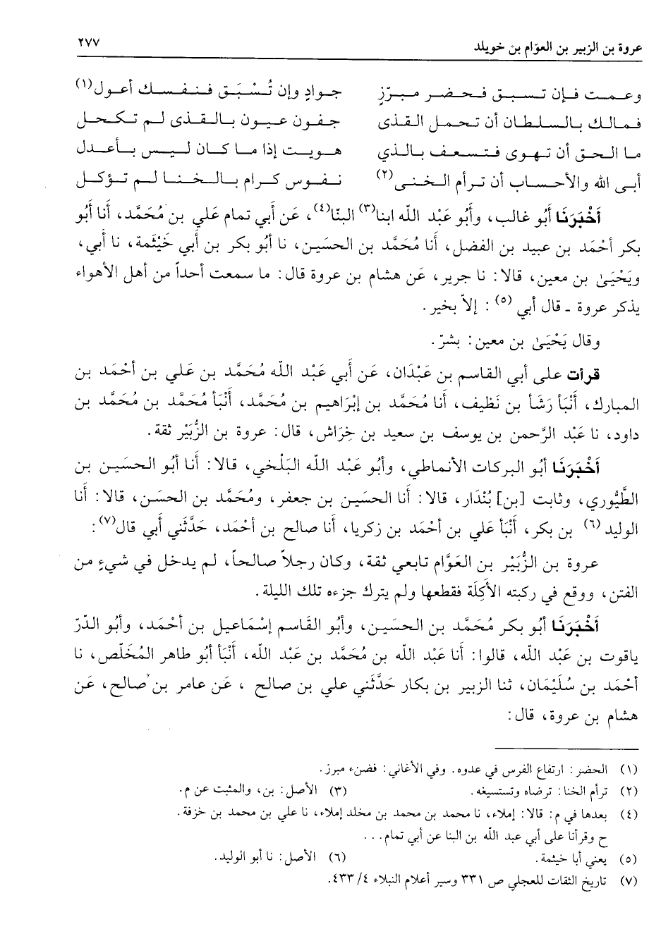 وعمت فإن تسبق فحضر مبرز * جواد وإن تسبق فنفسك أعول (1) فمالك بالسلطان أن تحمل القذى * جفون عيون بالقذى لم تكحل ما الحق أن تهوى فتسعف بالذي * هويت إذا ما كان ليس بأعدل أبى الله والأحساب أن ترأم الخنى (2) * نفوس كرام بالخنا لم تؤكل * أخبرنا أبو غالب وأبو عبد الله ابنا (3) البنا (4) عن أبي تمام علي بن محمد أنا أبو بكر أحمد بن عبيد بن الفضل أنا محمد بن الحسين نا أبو بكر بن أبي خيثمة نا أبي ويحيى بن معين قالا نا جرير عن هشام بن عروة قال ما سمعت أحدا من أهل الأهواء يذكر عروة قال أبي (5) إلا بخير وقال يحيى بن معين بشر قرأت على أبي القاسم بن عبدان عن أبي عبد الله محمد بن علي بن أحمد بن المبارك أنبأ رشأ بن نظيف أنا محمد بن إبراهيم بن محمد أنبأ محمد بن محمد بن داود نا عبد الرحمن بن يوسف بن سعيد بن خراش قال عروة بن الزبير ثقة أخبرنا أبو البركات الأنماطي وأبو عبد الله البلخي قالا أنا أبو الحسين بن الطيوري وثابت بن بندار قالا أنا الحسين بن جعفر ومحمد بن الحسن قالا أنا الوليد (6) بن بكر أنبأ علي بن أحمد بن زكريا أنا صالح بن أحمد حدثني أبي قال (7) عروة بن الزبير بن العوام تابعي ثقة وكان رجلا صالحا لم يدخل في شئ من الفتن ووقع في ركبته الأكلة فقطعها ولم يترك جزءه تلك الليلة أخبرنا أبو بكر محمد بن الحسين وأبو القاسم إسماعيل بن أحمد وأبو الدر ياقوت بن عبد الله قالوا أنا عبد الله بن محمد بن عبد الله أنبأ أبو طاهر المخلص نا أحمد بن سليمان ثنا الزبير بن بكار حدثني علي بن صالح عن عامر بن صالح عن هشام بن عروة قال