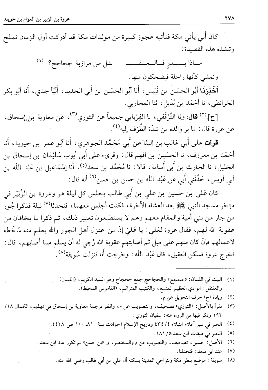 كان أبي يأتي مكة فتأتيه عجوز كبيرة من مولدات مكة قد أدركت أول الزمان تملح وتنشده هذ القصيدة * ماذا ببدر فالعقن * قل من مرازبة جحاحح (1) * وتمشي كأنها راحلة فيضحكون منها أخبرنا أبو الحسن بن قبيس أنا أبو الحسن بن أبي الحديد أنبأ جدي أنا أبو بكر الخرائطي نا أحمد بن بديل ثنا المحاربي ح (2) قال ونا الترقفي نا الفريابي جميعا عن الثوري (3) عن معاوية بن إسحاق عن عروة قال ما بر والده من شدة الطرف إليه (4) قرأت على أبي غالب بن البنا عن أبي محمد الجوهري أنا أبو عمر بن حيوية أنا أحمد بن معروف نا الحسين بن افهم قال وقرئ على أبي أيوب سليمان بن إسحاق بن الخليل نا الحارث بن أبي أسامة قالا نا محمد بن سعد (5) أنا إسماعيل بن عبد الله بن أبي أويس حدثني أبي عن عبد الله بن حسن بن حسن (6) أنه قال كان علي بن حسين بن علي بن أبي طالب يجلس كل ليلة هو وعروة بن الزبير في مؤخر مسجد النبي (صلى الله عليه وسلم) بعد العشاء الآخرة فكنت أجلس معهما فتحدثا (7) ليلة فذكرا جور من جار من بني أمية والمقام معهم وهم لا يستطيعون تغيير ذلك ثم ذكرا ما يخافان من عقوبة الله لهم فقال عروة لعلي يا علي إن من اعتزل أهل الجور والله يعلم منه سخطه لأعمالهم فإن كان منهم على ميل ثم أصابتهم عقوبة الله رجي له أن يسلم مما أصابهم قال فخرج عروة فسكن العقيق قال عبد الله وخرجت أنا فنزلت سويقة (8)