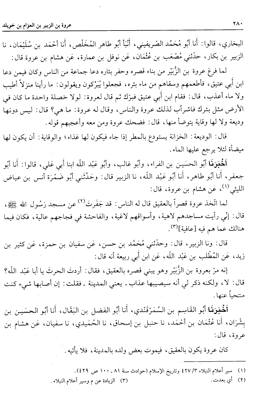 البخاري قالوا أنا أبو محمد الصريفيني أنبأ أبو طاهر المخلص أنا أحمد بن سليمان نا الزبير بن بكار حدثني مصعب بن عثمان عن نوفل بن عمارة عن هشام بن عروة قال لما فرغ عروة بن الزبير من بناء قصره وحفر بئاره دعا جماعة من الناس وكان فيمن دعا ابن أبي عتيق فأطعمهم وسقاهم من ماء بئره فجعلوا يبركون ويقولون ما رأينا منزلا أطيب ولا ماء أعذب قال فقام ابن أبي عتيق فبرك ثم قال لعروة لولا خصلة واحدة ما كان في الأرض مثل بئرك فاشرأب لذلك عروة والناس وقال له عروة ما هي قال ليس دونها وديعة ولا لها وقاية يتوضأ منها قال فضحك عروة ومن معه وأعجبهم قوله قال الوديعة الخزانة يستودع بالمطر إذا جاء فيكون لها غذاء والوقاية أن يكون لها ميضأة لئلا يرجع عليها الماء أخبرنا أبو الحسين بن الفراء وأبو غالب وأبو عبد الله ابنا أبي علي قالوا أنا أبو جعفر أنا أبو طاهر أنا أبو عبد الله نا الزبير قال وحدثني أبو ضمرة أنس بن عياض الليثي (1) عن هشام بن عروة قال لما اتخذ عروة قصرا بالعقيق قال له الناس قد جفرت (2) عن مسجد رسول الله (صلى الله عليه وسلم) قال إني رأيت مساجدهم لاهية وأسواقهم لاغية والفاحشة في فجاجهم عالية فكان فيما هنالك عما هم فيه عافية (3) قال ونا الزبير قال وحدثني محمد بن حسن عن سفيان بن حمزة عن كثير بن زيد عن المطلب بن عبد الله عن ابن أبي ربيعة أنه قال إنه مر بعروة بن الزبير وهو يبني قصره بالعقيق فقال أردت الحرث يا أبا عبد الله قال لا ولكنه ذكر لي أنه سيصيبها عذاب يعني المدينة فقلت إن أصابها شئ كنت منتحيا عنها أخبرنا أبو القاسم بن السمرقندي أنا أبو الفضل بن البقال أنا أبو الحسين بن بشران أنا عثمان بن أحمد نا حنبل بن إسحاق نا الحميدي نا سفيان عن هشام بن عروة قال كان عروة يكون بالعقيق فيموت بعض ولده بالمدينة فلا يأتيه