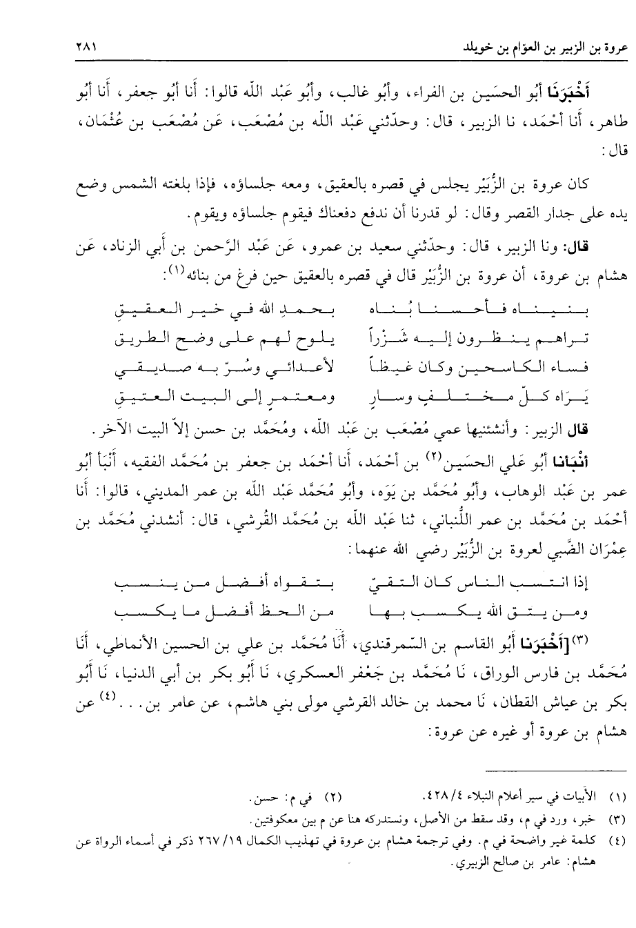 أخبرنا أبو الحسين بن الفراء وأبو غالب وأبو عبد الله قالوا أنا أبو جعفر أنا أبو طاهر أنا أحمد نا الزبير قال وحدثني عبد الله بن مصعب عن مصعب بن عثمان قال كان عروة بن الزبير يجلس في قصره بالعقيق ومعه جلساؤه فإذا بلغته الشمس وضع يده على جدار القصر وقال لو قدرنا أن ندفع دفعناك فيقوم جلساؤه ويقوم قال ونا الزبير قال وحدثني سعيد بن عمرو عن عبد الرحمن بن أبي الزناد عن هشام بن عروة أن عروة بن الزبير قال في قصره بالعقيق حين فرغ من بنائه (1) * بنيناه فأحسنا بناه * بحمد الله في خير العقيق تراهم ينظرون إليه شزرا * يلوح لهم على وضح الطريق فساء الكاسحين وكان غيظا * لأعدائي وسر به صديقي يراه كل مختلف وسار * ومعتمر إلى البيت العتيق * قال الزبير وأنشنيها عمي مصعب بن عبد الله ومحمد بن الحسن إلا البيت الآخر أنبأنا أبو علي الحسين (2) بن أحمد أنا أحمد بن جعفر بن محمد الفقيه أنبأ أبو عمر بن عبد الوهاب وأبو محمد بن يوه وأبو محمد عبد الله بن عمر المديني قالوا أنا أحمد بن محمد بن عمر اللنباني ثنا عبد الله بن محمد القرشي قال أنشدني محمد بن عمران الضبي لعروة بن الزبير Bهما * إذا انتسب الناس كان التقي * بتقواه أفضل من ينسب ومن يتق الله يكسب بها * من الحظ أفضل ما يكسب * (3) أخبرنا أبو القاسم بن السمرقندي أنا محمد بن علي بن الحسين الأنماطي أنا محمد بن فارس الوراق نا محمد بن جعفر العسكري نا أبو بكر بن أبي الدنيا نا أبو بكر بن عياش القطان نا محمد بن خالد القرشي مولى بني هاشم عن عامر بن